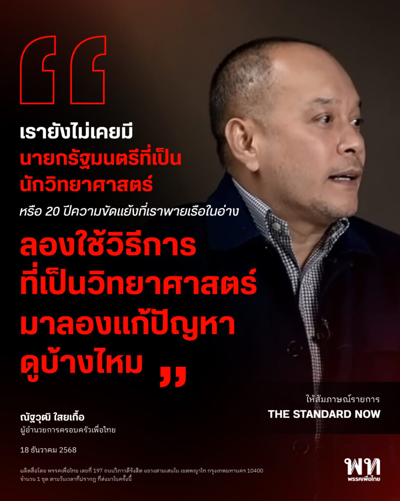 ณัฐวุฒิ ใสยเกื้อ ผู้อำนวยการครอบครัวเพื่อไทย พูดคุยกับ อ๊อฟ ชัยนนท์ ในรายการ THE STANDARD NOW (17 ธันวาคม 2568) ฉายภาพการเมืองไทยในปัจจุบันในการก้าวไปสู่การเลือกตั้งครั้งใหม่ที่กำลังจะมาถึง ในการพูดคุย ณัฐวุฒิ เป็นตัวแทนของพรรคเพื่อไทยในภูมิทัศน์การเมืองปัจจุบัน ให้ภาพการเมืองที่ณัฐวุฒินิยามว่าเป็น ‘การเมืองสามก๊ก’ โดยในการฉายภาพการเมืองไทยเพื่อนำไปสู่การเลือกตั้ง ณัฐวุฒิ กล่าวถึงบทบาทและจุดยืนของพรรคเพื่อไทยในการเข้าสู่สนามเลือกตั้ง และเสนอตัวเลือกเพื่อเข้าแก้ปัญหาการเมืองและปัญหา รวมถึงความท้าทายต่างๆ ที่ประเทศไทยกำลังเผชิญ