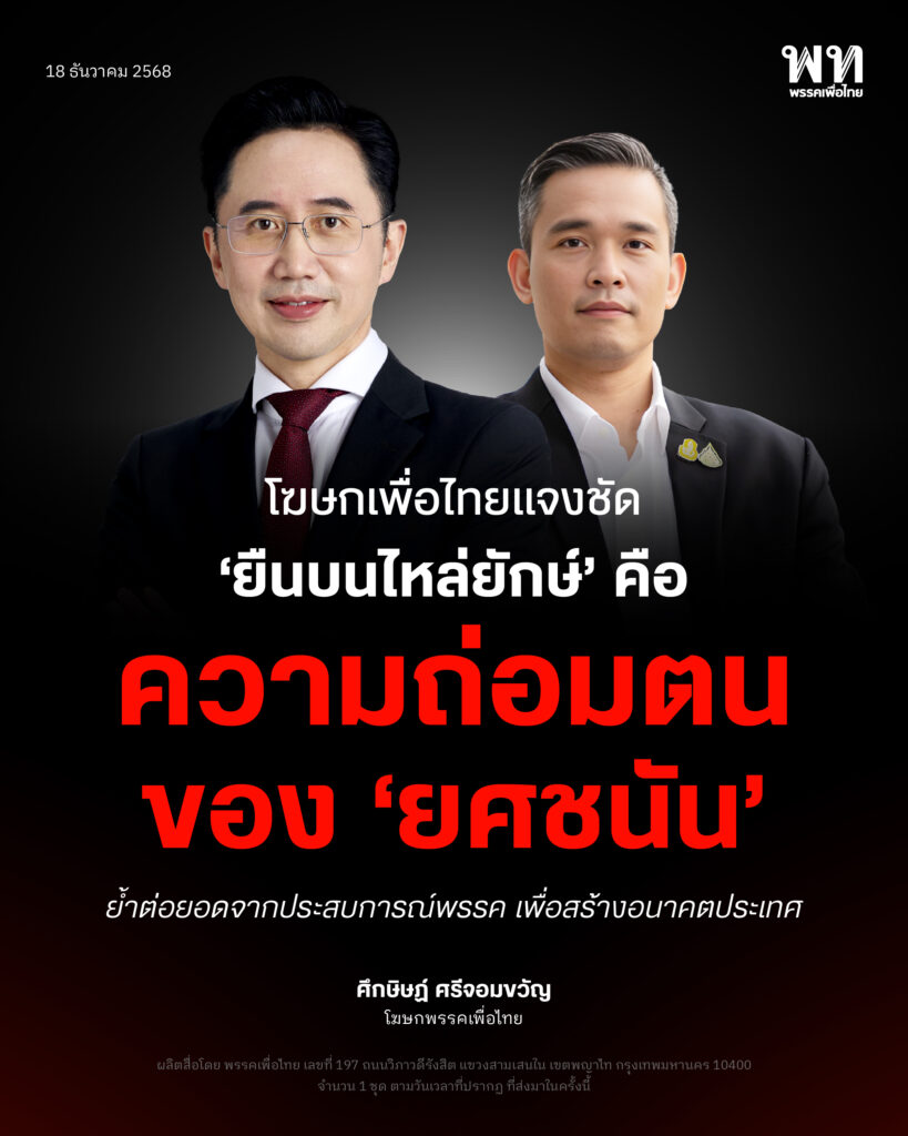 18 ธ.ค. 2568 ศึกษิษฏ์ ศรีจอมขวัญ โฆษกพรรคเพื่อไทย เปิดเผยว่า หลังจากได้ชมรายการกรรมกรข่าวคุยนอกจอ เมื่อวานนี้ ซึ่งมีการสัมภาษณ์ ศ.ดร.ยศชนัน วงศ์สวัสดิ์ แคนดิเดตนายกรัฐมนตรีของพรรคเพื่อไทย ที่ตอบคำถามถึงความเกี่ยวข้องกับความสัมพันธ์กับตระกูลชินวัตร โดยคำตอบของ ศ.ดร. ยศชนัน คือ เราอาจจะเป็นคนตัวเล็กบนมือของยักษ์ใจดี