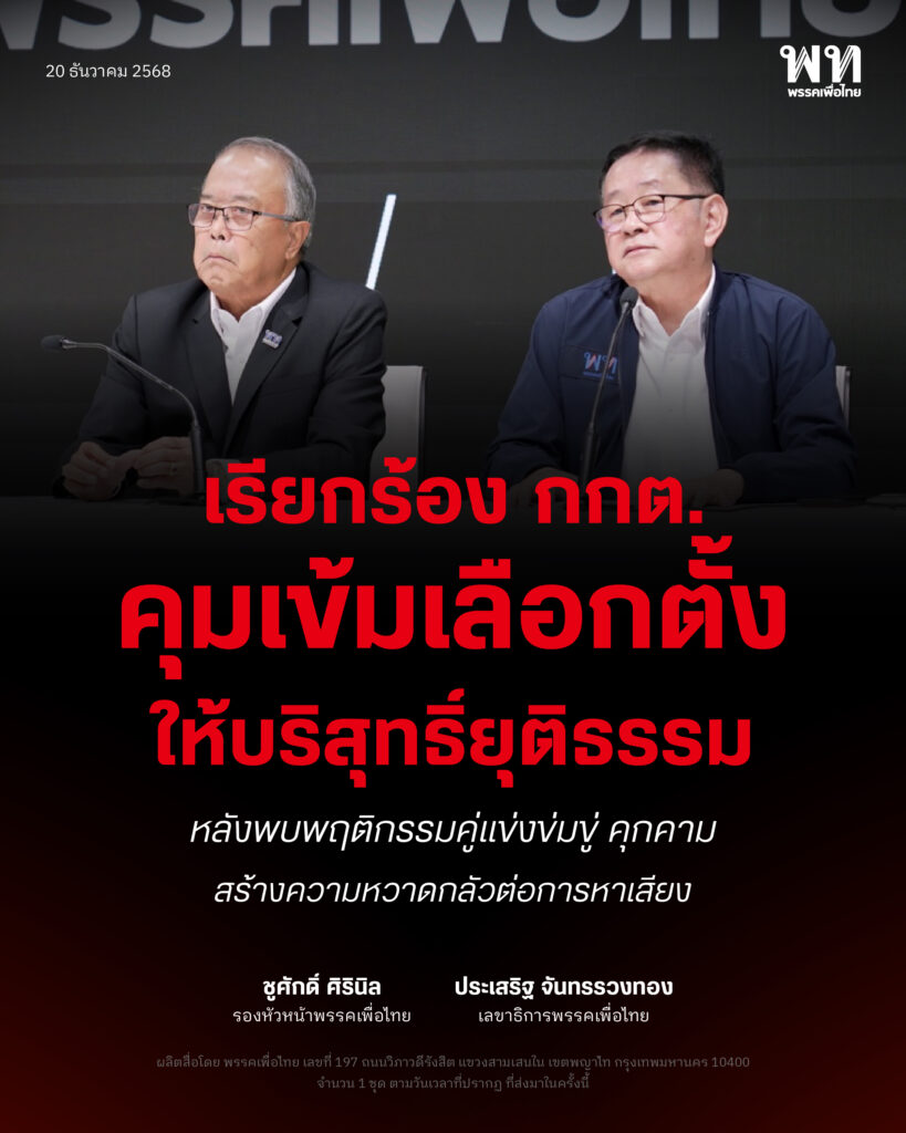 พรรคเพื่อไทย เรียกร้อง กกต.คุมเข้มเลือกตั้งให้บริสุทธิ์ยุติธรรม หลังผู้สมัครฯ สส. แจ้งมีบุคคลใช้อำนาจข่มขู่ คุกคาม สร้างความหวาดกลัวต่อการหาเสียงเลือกตั้ง