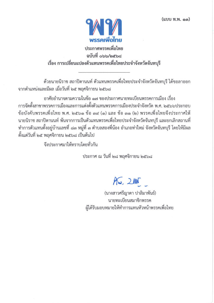 ประกาศพรรคเพื่อไทย ฉบับที่ ๑๖๖/๒๕๖๘ เรื่อง การเปลี่ยนแปลงตัวแทนพรรคเพื่อไทยประจำจังหวัดจันทบุรี