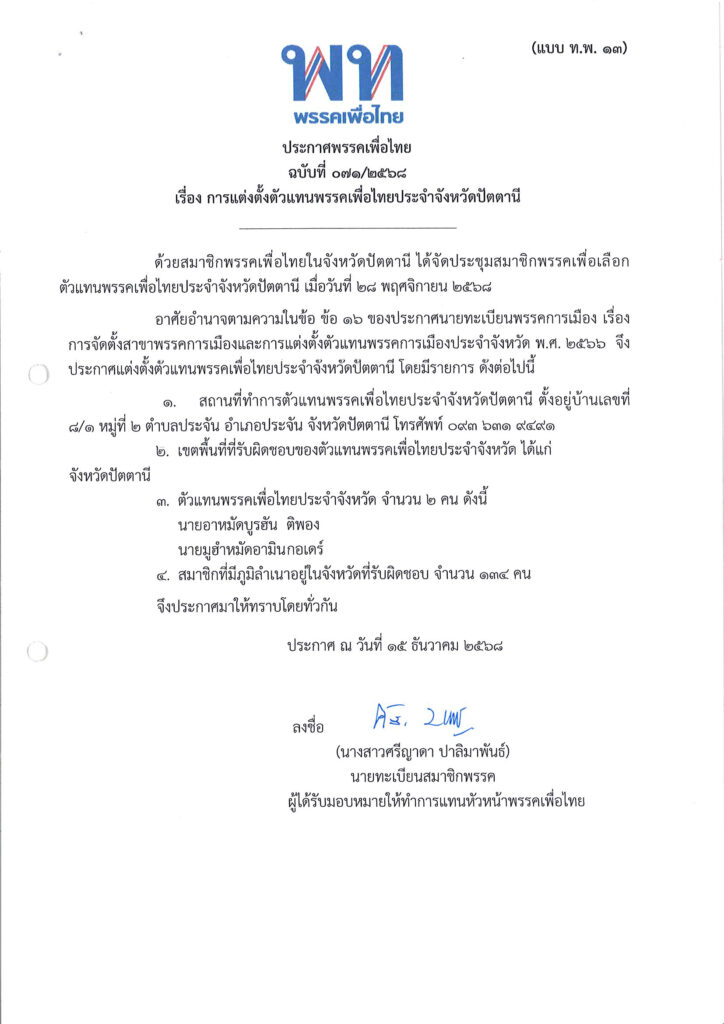 ประกาศพรรคเพื่อไทย ฉบับที่ ๐๗๑/๒๕๖๘ เรื่อง การแต่งตั้งตัวแทนพรรคเพื่อไทยประจำจังหวัดปัตตานี