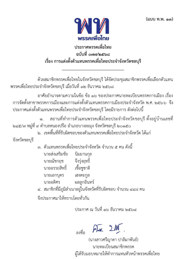 ประกาศพรรคเพื่อไทย ฉบับที่ ๐๗๗/๒๕๖๘ เรื่อง การแต่งตั้งตัวแทนพรรคเพื่อไทยประจำจังหวัดชลบุรี