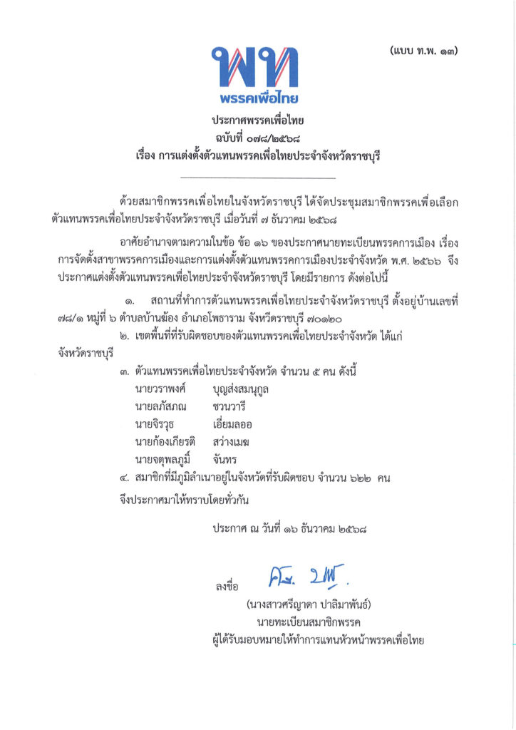 ประกาศพรรคเพื่อไทย ฉบับที่ ๐๗๘/๒๕๖๘ เรื่อง การแต่งตั้งตัวแทนพรรคเพื่อไทยประจำจังหวัดราชบุรี