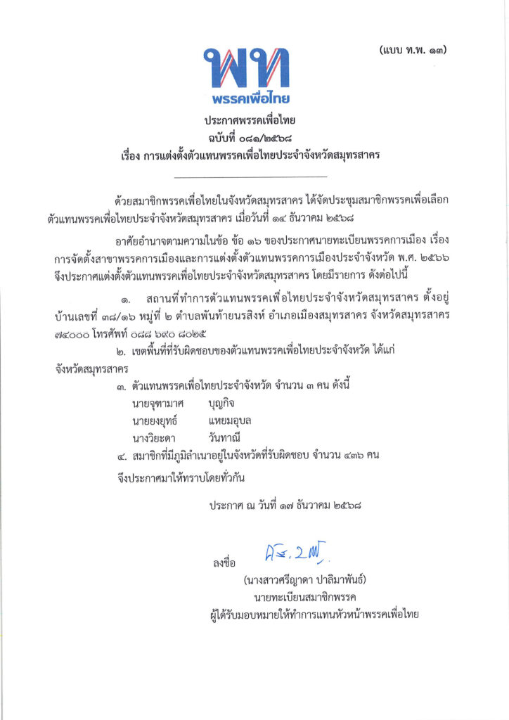 ประกาศพรรคเพื่อไทย ฉบับที่ ๐๘๑/๒๕๖๘ เรื่อง การแต่งตั้งตัวแทนพรรคเพื่อไทยประจำจังหวัดสมุทรสาคร