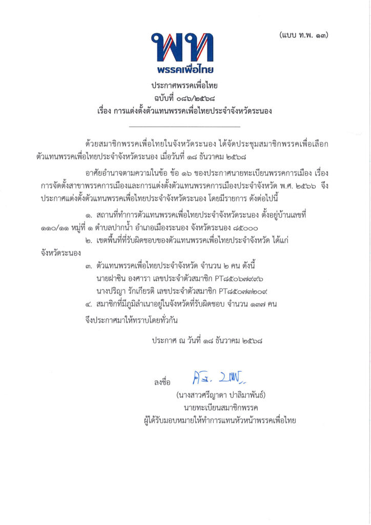 ประกาศพรรคเพื่อไทย ฉบับที่ ๐๘๖/๒๕๖๘ เรื่อง การแต่งตั้งตัวแทนพรรคเพื่อไทยประจำจังหวัดระนอง