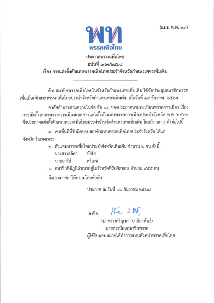 ประกาศพรรคเพื่อไทย ฉบับที่ ๐๘๗/๒๕๖๘ เรื่อง การแต่งตั้งตัวแทนพรรดเพื่อไทยประจำจังหวัดกำแพงเพชรเพิ่มเติม