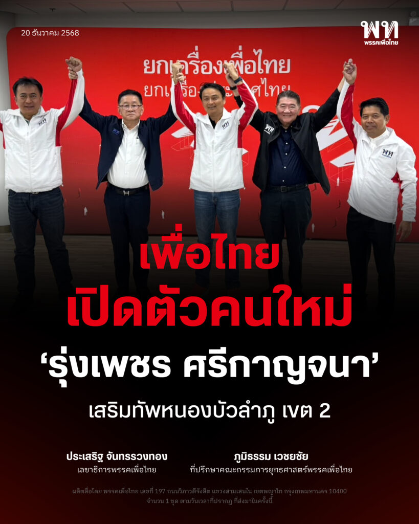 20 ธ.ค. 2568 14.30 น. ที่พรรคเพื่อไทย นายประเสริฐ จันทรรวงทอง เลขาธิการพรรคเพื่อไทย นายภูมิธรรม เวชยชัย ที่ปรึกษาคณะกรรมการยุทธศาสตร์พรรคเพื่อไทย ได้เปิดตัว และสวมเสื้อต้อนรับว่าที่ผู้สมัคร สส. จังหวัดหนองบัวลำภู เขต 2 คือ นายรุ่งเพชร ศรีกาญจนา แทนนายไชยา พรหมา ซึ่งได้แจ้งความประสงค์ลาออกจากพรรคไปก่อนหน้านี้