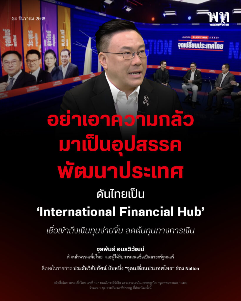 สำหรับพรรคเพื่อไทยเองเรามีนโยบายที่ก้าวหน้าหลายนโบาย Financial Hub เป็นอีกตัวหนึ่ง การที่เราบอกว่าเรากลัวทุนเทา ผมบอกว่าเราดูตัวอย่างง่ายๆ อย่างประเทศที่ขึ้นชื่อว่าเป็น International Financial Hub อย่างประเทศดูไบ สิงคโปร์ เขาเกิดปัญหาเรื่องทุนเทาหรือไม่ เขามีกฎหมายที่กำกับดูแล ซึ่งเราเองก็ต้องการทำกฏหมายเหล่านี้ เราก็มาช่วยกันทำสิครับ มันเป็นหน้าที่ของ สส. เราก็แค่ทำกฏหมายให้มันรัดกุม และสามารถปกป้องประเทศ เป็นโล่ป้องกันประเทศให้มันเหมาะสม