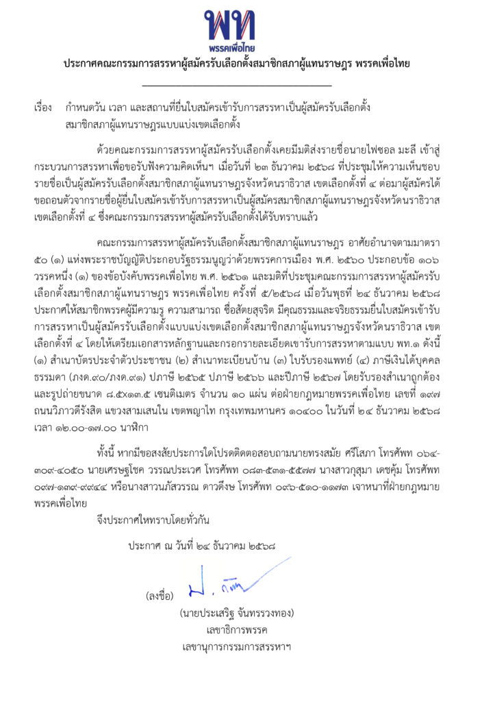 ประกาศคณะกรรมการสรรหาผู้สมัครรับเลือกตั้งสมาชิกสภาผู้แทนราษฎร เรื่อง กำหนดวัน เวลา และสถานที่ยื่นใบสมัครเข้ารับการสรรหาเป็นผู้สมัครรับเลือกตั้ง สมาชิกสภาผู้แทนราษฎรแบบแบ่งเขตเลือกตั้ง จังหวัดนราธิวาส