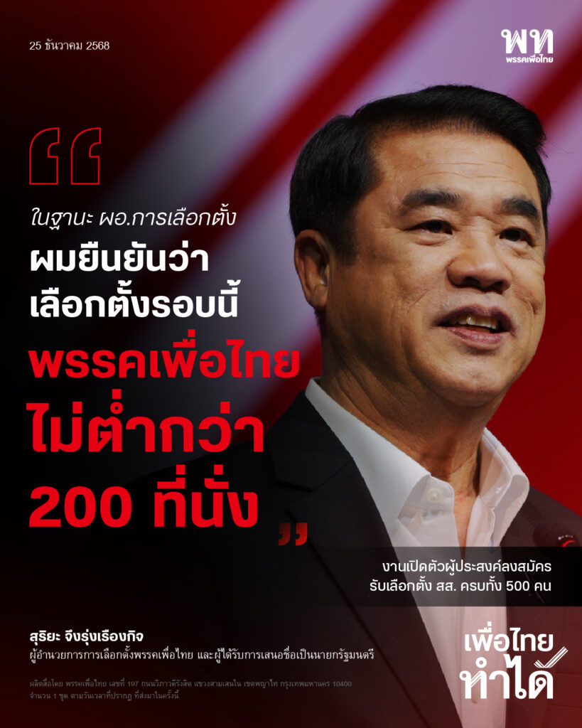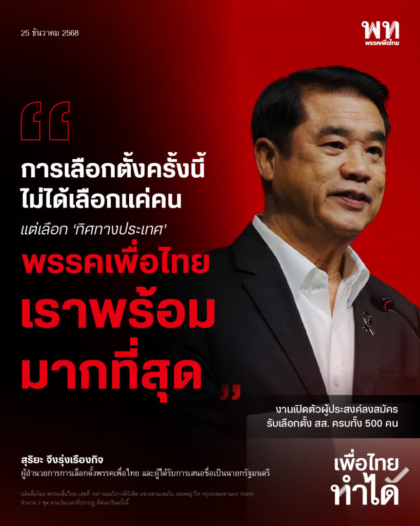 วันที่ 25 ธันวาคม 2568 เวลา 10.30 น. ที่พรรคเพื่อไทย นายสุริยะ จึงรุ่งเรืองกิจ ผู้อำนวยการการเลือกตั้งพรรคเพื่อไทย และผู้ได้รับการเสนอชื่อเป็นนายกรัฐมนตรี ได้กล่าวแสดงวิสัยทัศน์ ในโอกาสเปิดตัวผู้ประสงค์ลงสมัครรับเลือกตั้ง สส.ครบทั้ง 500 คน ชูสโลแกน “เพื่อไทยทำได้ ทำให้ไทยยิ่งใหญ่ เลือกพรรคเพื่อไทย”
