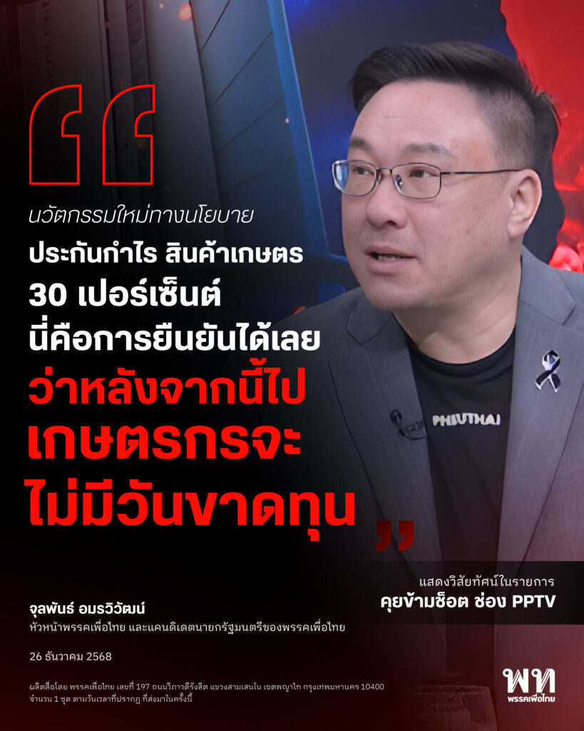 แสดงวิสัยทัศน์ในเรื่องการออกแบบนโยบายของพรรคเพื่อไทย ในรายการคุยข้ามช็อต ช่อง PPTV เมื่อวันที่ 26 ธ.ค. 2568