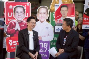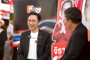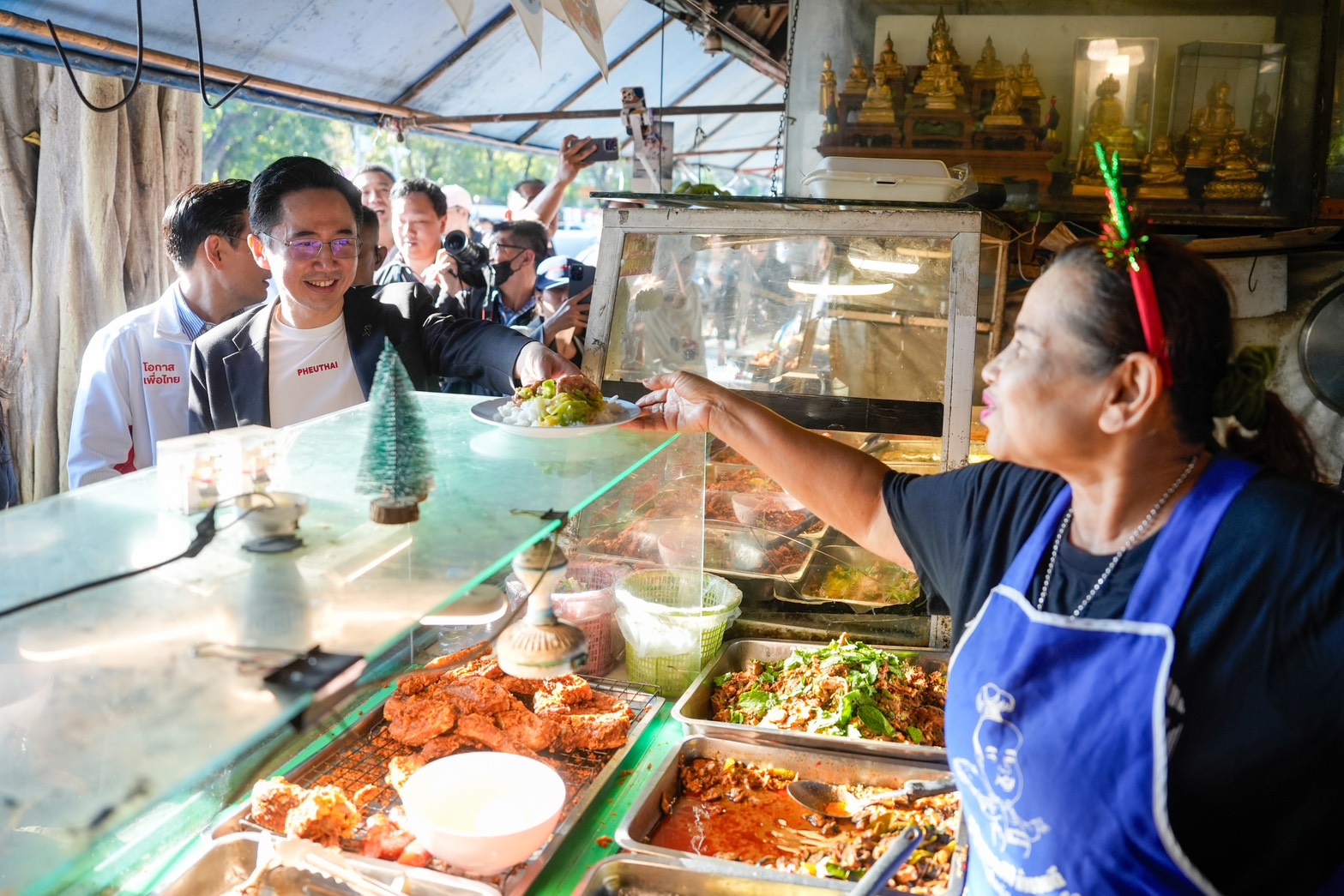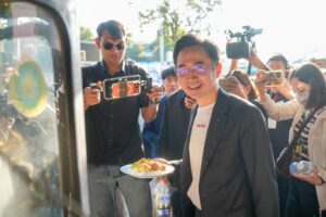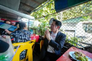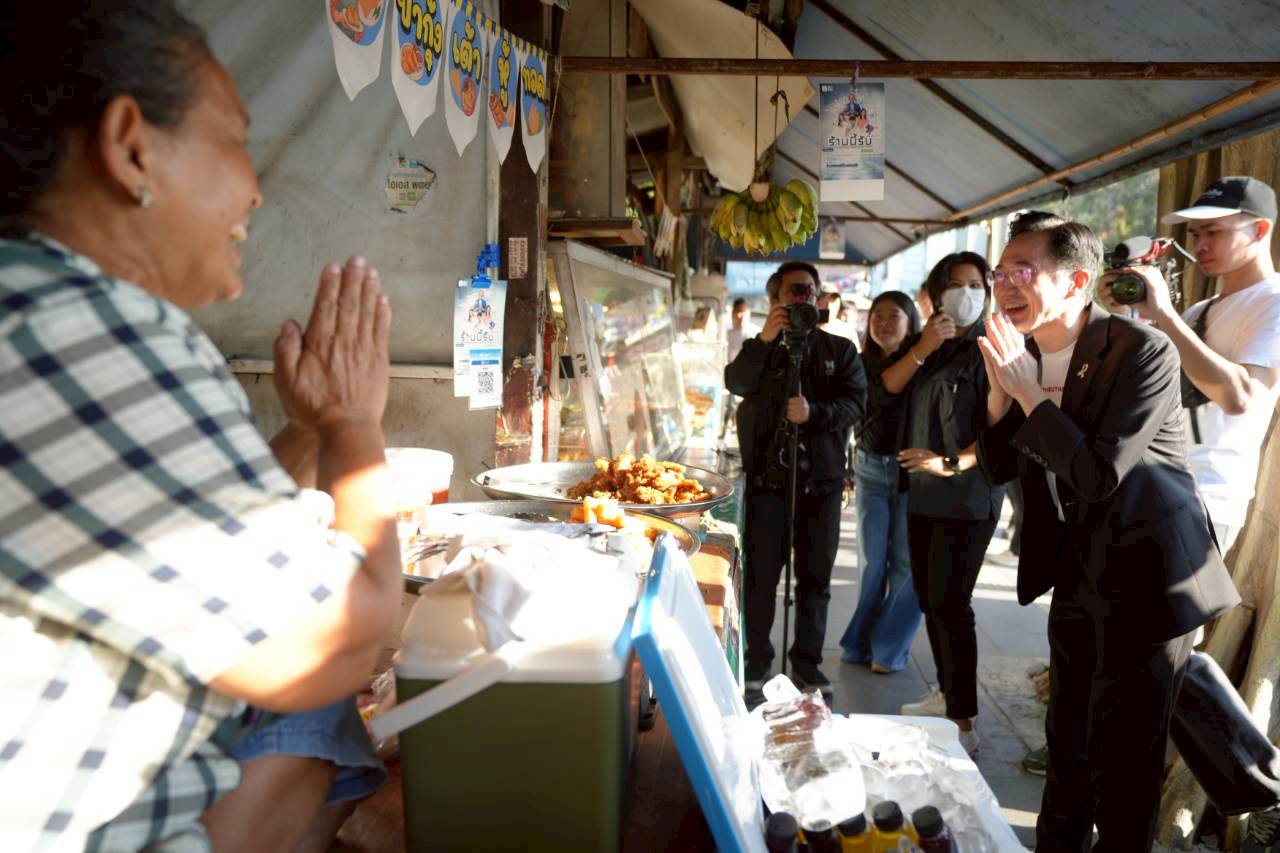 จากนั้นได้เดินไปทักทายพูดคุยกับพ่อค้าแม่ค้าอาหาร เพื่อสอบถามบรรยากาศการค้าขายที่หน้าสนามกีฬาไทย-ญี่ปุ่น ระหว่างรอการจับสลากเลือกหมายเลขของผู้สมัคร สส.กทม. ในเช้าวันนี้