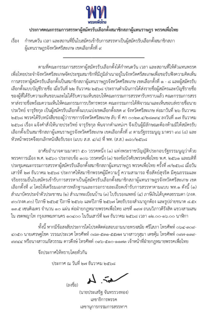 ประกาศคณะกรรมการสรรหาผู้สมัครรับเลือกตั้งสมาชิกสภาผู้แทนราษฎร พรรคเพื่อไทย เรื่อง กำหนดวัน เวลา และสถานที่ยื่นใบสมัครเข้ารับการสรรหาเป็นผู้สมัครรับเลือกตั้งสมาชิกสภา ผู้แทนราษฎรจังหวัดศรีสะเกษ เขตเลือกตั้งที่ ๙