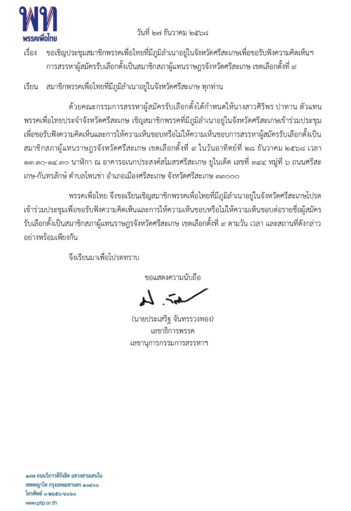 ขอเชิญประชุมสมาชิกพรรคเพื่อไทยที่มีภูมิลำเนาอยู่ในจังหวัดศรีสะเกษเพื่อขอรับฟังความคิดเห็นฯ การสรรหาผู้สมัครรับเลือกตั้งเป็นสมาชิกสภาผู้แทนราษฎรจังหวัดศรีสะเกษ เขตเลือกตั้งที่ ๙