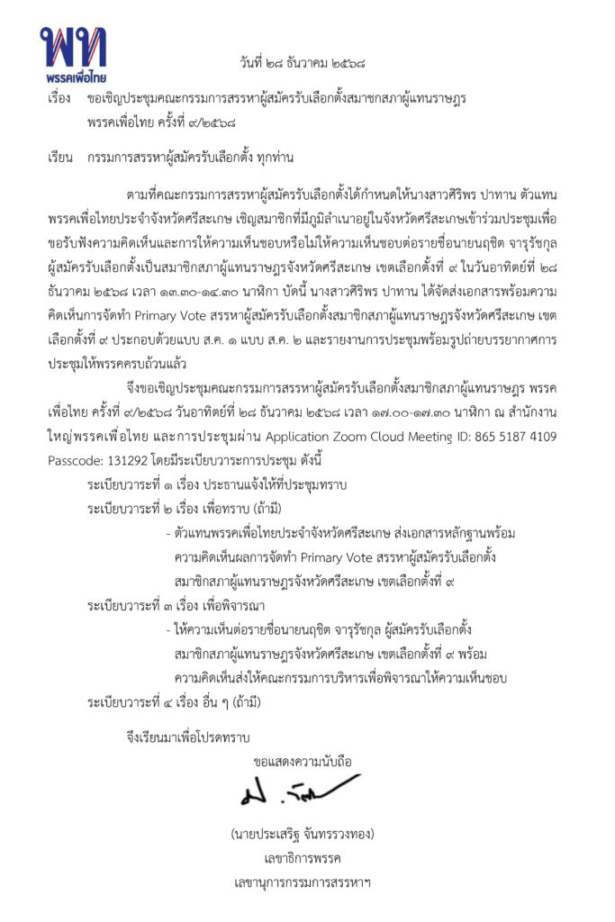 ขอเชิญประชุมคณะกรรมการสรรหาผู้สมัครรับเลือกตั้งสมาชกสภาผู้แทนราษฎร พรรคเพื่อไทย ครั้งที่ ๙/๒๕๖๘