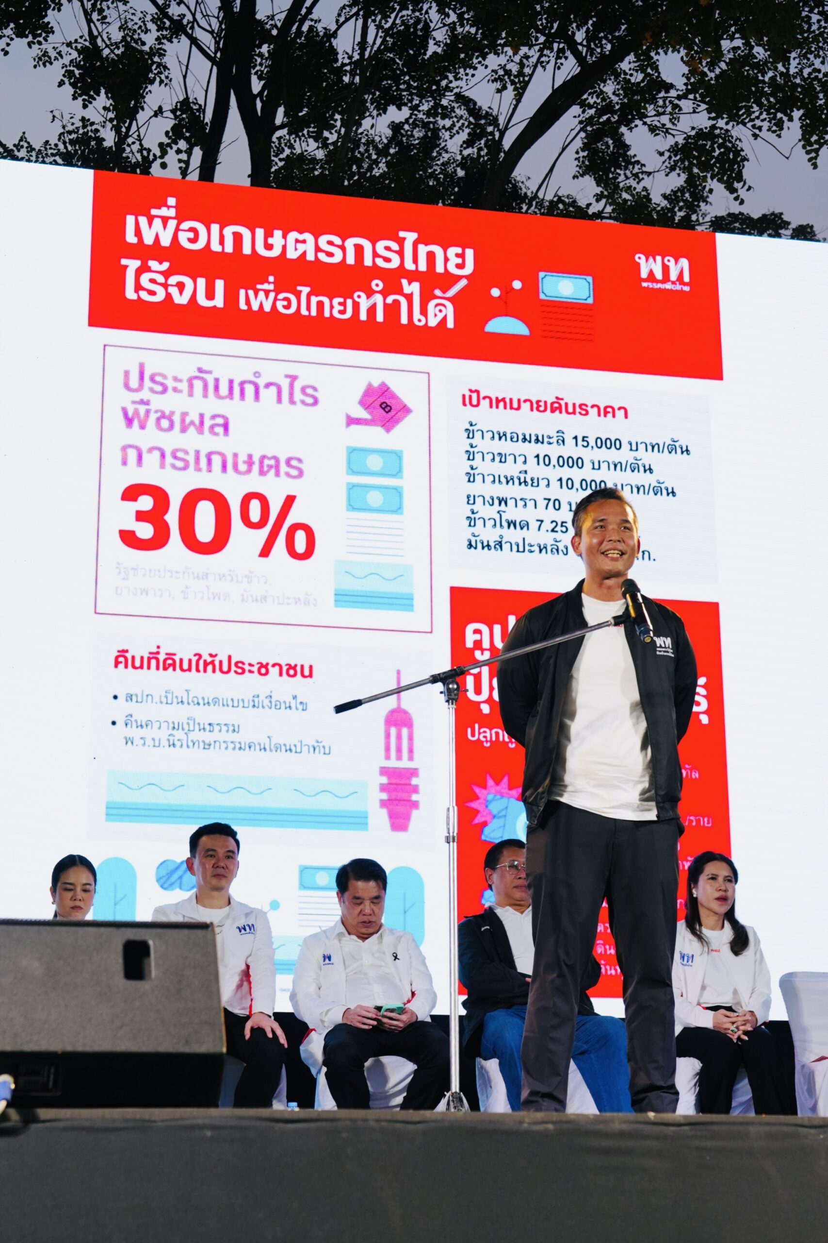 โดยในเวทีนี้มี สุริยะ จึงรุ่งเรืองกิจ ผู้อำนวยการการเลือกตั้ง และแคนดิเดตนายกรัฐมนตรีของพรรคเพื่อไทยเป็นผู้นำการปราศรัยเป็นเวทีแรก พร้อมด้วย ศึกษิษฏ์ ศรีจอมขวัญ โฆษกพรรค จักรภพ เพ็ญแข ผู้สมัคร สส. แบบบัญชีรายชื่อ สุภาภรณ์ คงวุฒิปัญญา ผู้สมัคร สส. แบบบัญชีรายชื่อ นวรัตน์ อยู่บำรุง , สุพิน คล้ายนก และขัตติยา สวัสดิผล รองเลขาธิการพรรค