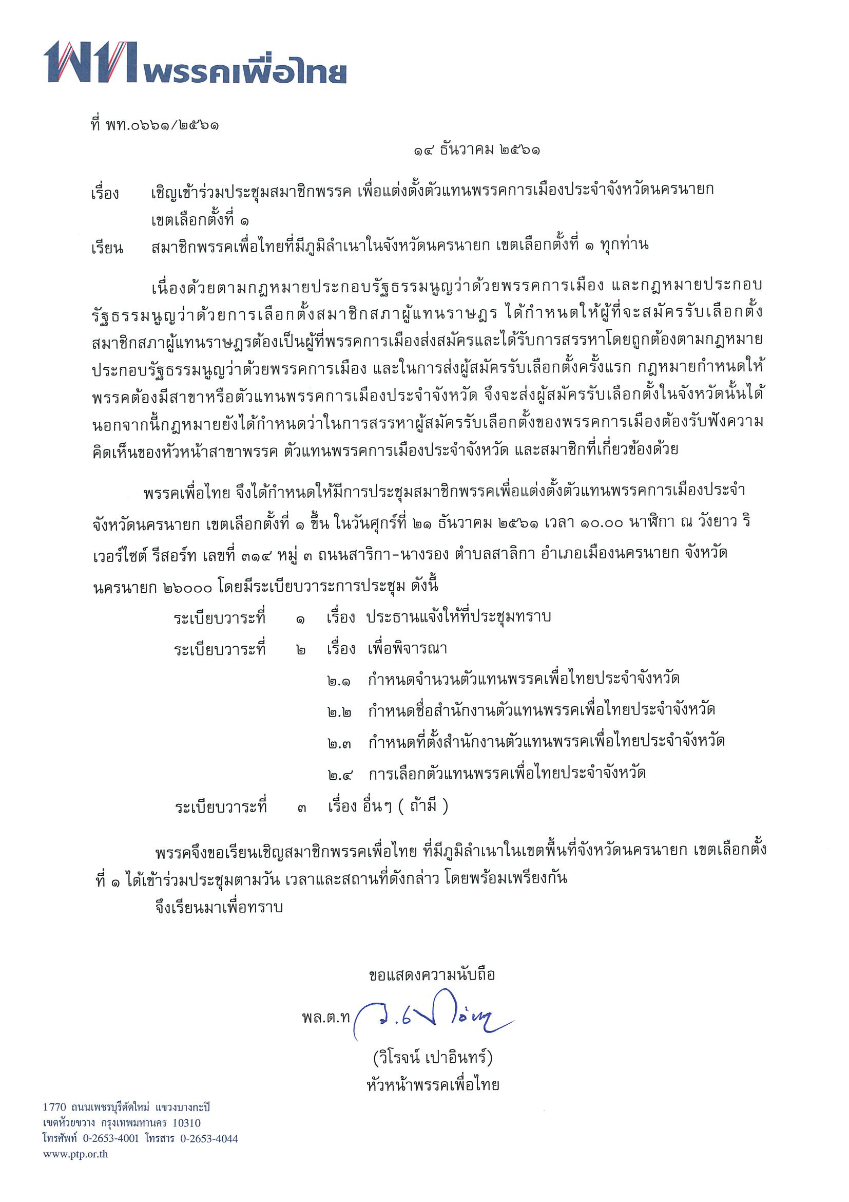 เชิญเข้าร่วมประชุมสมาชิกพรรคเพื่อแต่งตั้งตัวแทนสมาชิกพรรคการเมืองประจำจังหวัดนครนายก เขตเลือกตั้งที่ 1