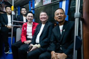 ต่อมาในเวลา 06.00 น. คณะผู้บริหารและผู้สมัครทั้งหมด ได้เคลื่อนขบวนออกจากพรรคด้วยคาราวาน “รถเมล์ไฟฟ้า” (EV Bus) มุ่งหน้าสู่โรงแรมเซ็นทารา ไลฟ์ ศูนย์ราชการและคอนเวนชันเซ็นเตอร์ แจ้งวัฒนะ โดยเดินทางถึงในเวลา 07.00 น. เพื่อเตรียมความพร้อมเข้าสู่ขั้นตอนการจับสลากหมายเลขพรรคในเวลา 08.00 น.