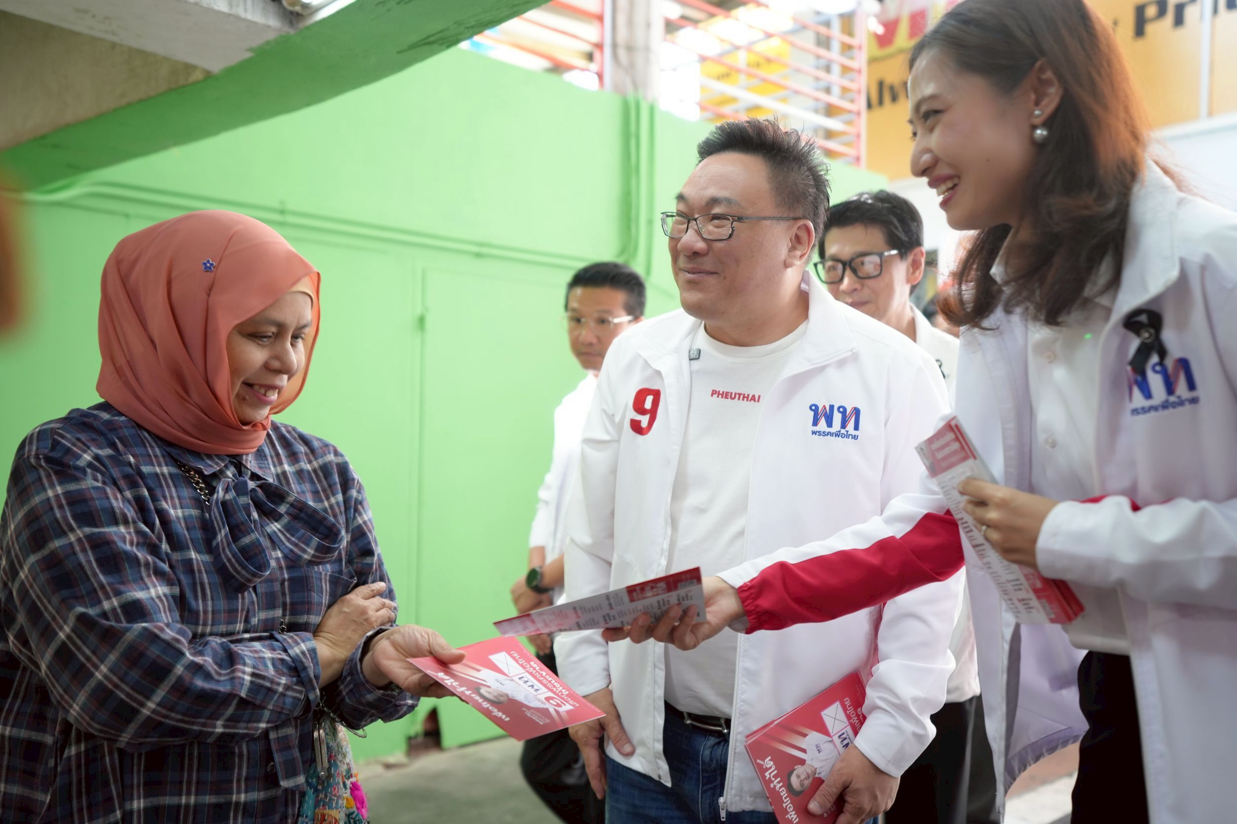 สำหรับคณะพรรคเพื่อไทยที่ร่วมลงพื้นที่ครั้งนี้ ประกอบด้วย นายวิชาญ มีนชัยนันท์ อดีตรัฐมนตรีช่วยว่าการกระทรวงสาธารณสุข, นายชนินทร์ รุ่งธนเกียรติ รองเลขาธิการพรรค และผู้สมัคร สส.แบบบัญชีรายชื่อ น.ส.ขัตติยา สวัสดิผล รองเลขาธิการพรรค และผู้สมัคร สส.แบบบัญชีรายชื่อ นายศึกษิษฏ์ ศรีจอมขวัญ โฆษกพรรค และผู้สมัคร สส.แบบบัญชีรายชื่อ นายพลภูมิ วิภัติภูมิประเทศ ผู้สมัคร สส.กทม. เขต 15 เบอร์ 6 นายพีรวิชญ์ ขันติศุข ผู้สมัคร สส.แบบบัญชีรายชื่อ นายสุรเกียรติ เทียนทอง ผู้สมัคร สส.แบบบัญชีรายชื่อ นายวิรัตน์ มีนชัยนันท์ ผู้สมัคร สส.แบบบัญชีรายชื่อ นายธงธรรม เวชยชัย ผู้สมัคร สส.แบบบัญชีรายชื่อ