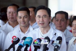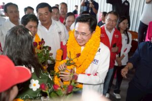 สำหรับคณะพรรคเพื่อไทย ประกอบด้วย นายวิสุทธิ์ ไชยณรุณ รองหัวหน้าพรรคเพื่อไทย และผู้สมัคร สส.แบบบัญชีรายชื่อ, นายอนุชา นาคาศัย อดีต รมช.เกษตรและสหกรณ์ และผู้สมัคร สส.เขต 1 ชัยนาท, น.ส.ณัฐธิดา เทพสุทิน ผู้สมัคร สส.แบบบัญชีรายชื่อ, นายพงศ์ศรัณย์ อัศวชัยโสภณ ผู้สมัคร สส.แบบบัญชีรายชื่อ, นายชัย วัชรงค์ ผู้สมัคร สส.แบบบัญชีรายชื่อ