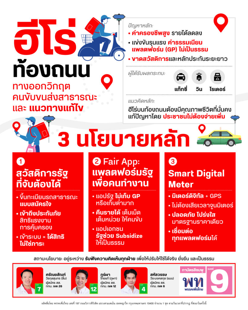 “ศรัณยสัณฑ์ – ภูร์ผา – สหัสวรรษ” ผู้สมัคร สส. กทม. เพื่อไทย ผนึกกำลังเสนอทางออกวิกฤต “ฮีโร่บนท้องถนน” ชู 3 นโยบายหลัก ยกระดับชีวิตและคืนกำไรให้คนขับ โดยประชาชนไม่ต้องจ่ายเพิ่ม