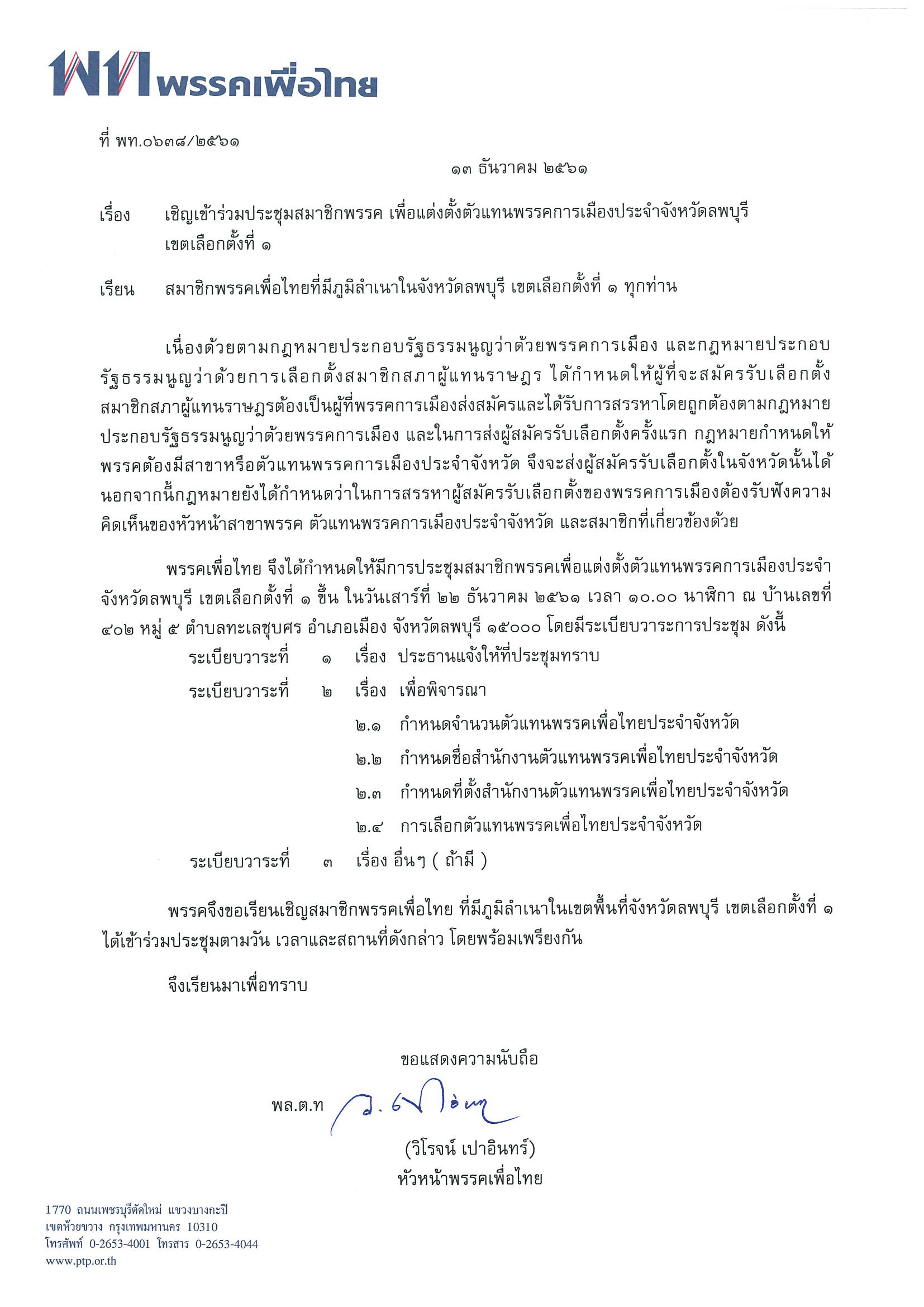 เชิญเข้าร่วมประชุมสมาชิกพรรคเพื่อแต่งตั้งตัวแทนสมาชิกพรรคการเมืองประจำจังหวัดลพบุรี เขตเลือกตั้งที่ 1