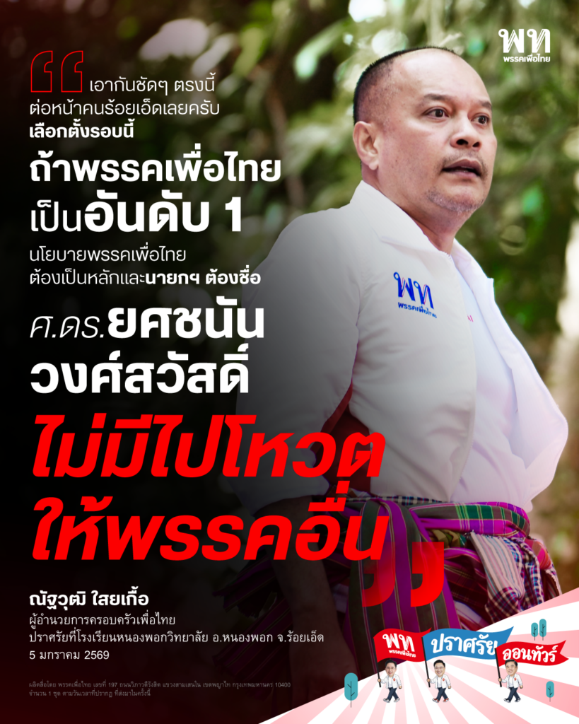 “เอากันชัดๆตรงนี้ต่อหน้าคนร้อยเอ็ดเลยครับ เลือกตั้งรอบนี้ถ้าพรรคเพื่อไทยเป็นอันดับ 1 นโยบายพรรคเพื่อไทยต้องเป็นหลัก และนายกฯ ต้องชื่อ ศ.ดร.ยศชนัน วงศ์สวัสดิ์ ไม่มีไปโหวตให้พรรคอื่น”