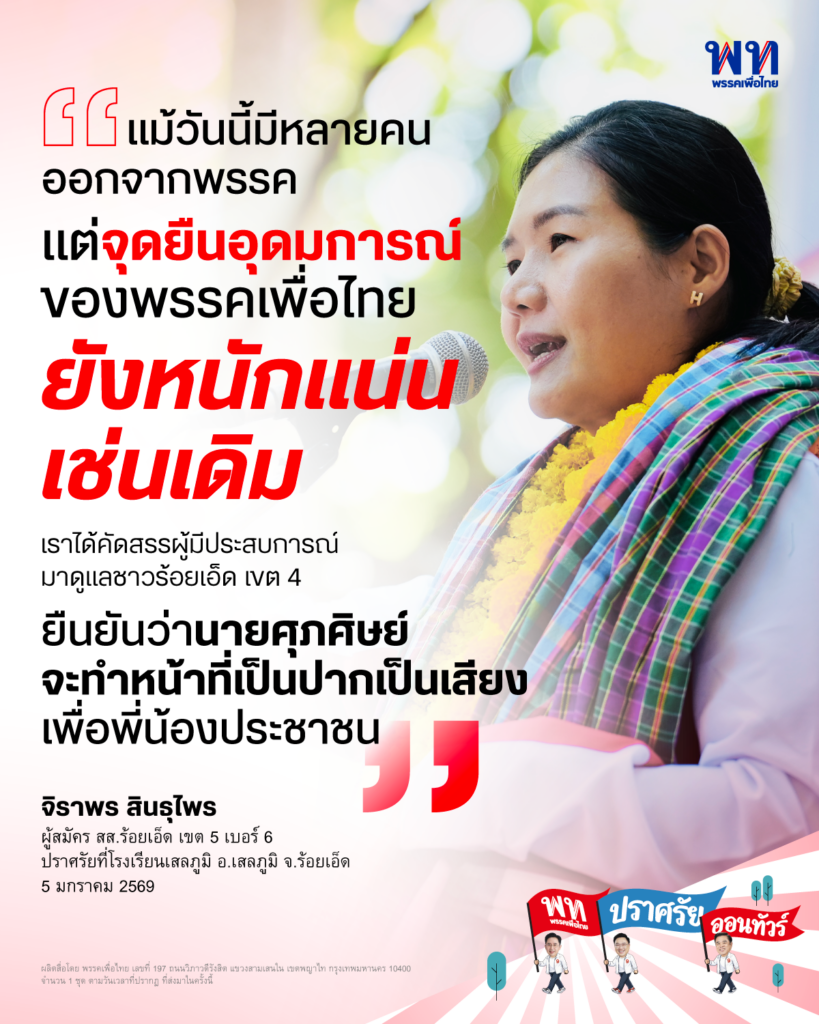 “วันนี้มีหลายคนออกจากพรรค แต่จุดยืนอุดมการณ์ของพรรคเพื่อไทยยังหนักแน่นเช่นเดิม เราได้คัดสรรผู้มีประสบการณ์มาดูแลชาวร้อยเอ็ด เขต 4 ยืนยันว่านายศุภศิษย์จะทำหน้าที่เป็นปากเป็นเสียงเพื่อประชาชน” นางสาวจิราพร กล่าว