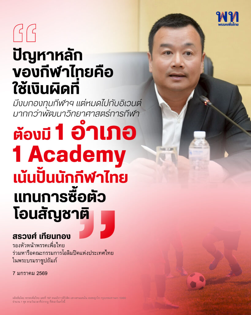 นายสรวงศ์ เทียนทอง รองหัวหน้าพรรคเพื่อไทย กล่าวถึงการพัฒนาวงการกีฬาไทยในระหว่างการหารือกับคณะกรรมการโอลิมปิคแห่งประเทศไทย ในพระบรมราชูปถัมภ์ เมื่อวันที่ 6 มกราคม 2569 ว่าไทยใช้เงินพัฒนากีฬาผิดที่ผิดทางเพราะแทนที่จะใช้เงินเพื่อพัฒนาวิทยาศาสตร์การกีฬา แต่กลับใช้เงินไปกับการจัดอิเวนต์ พร้อมเสนอ “1 อำเภอ 1 Academy” ปั้นนักกีฬาไทยเองแทนการซื้อตัวโอนสัญชาตินักกีฬา เพื่อให้นักกีฬาไทยได้มีอาชีพ