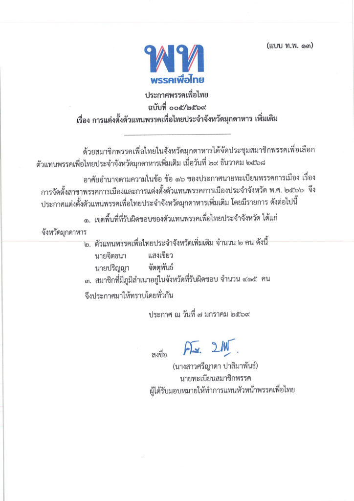ประกาศพรรคเพื่อไทย ฉบับที่ ๐๐๕/๒๕๖๙ เรื่องการแต่งตั้งตัวแทนพรรคเพื่อไทยประจำจังหวัดมุกดาหาร เพิ่มเติม