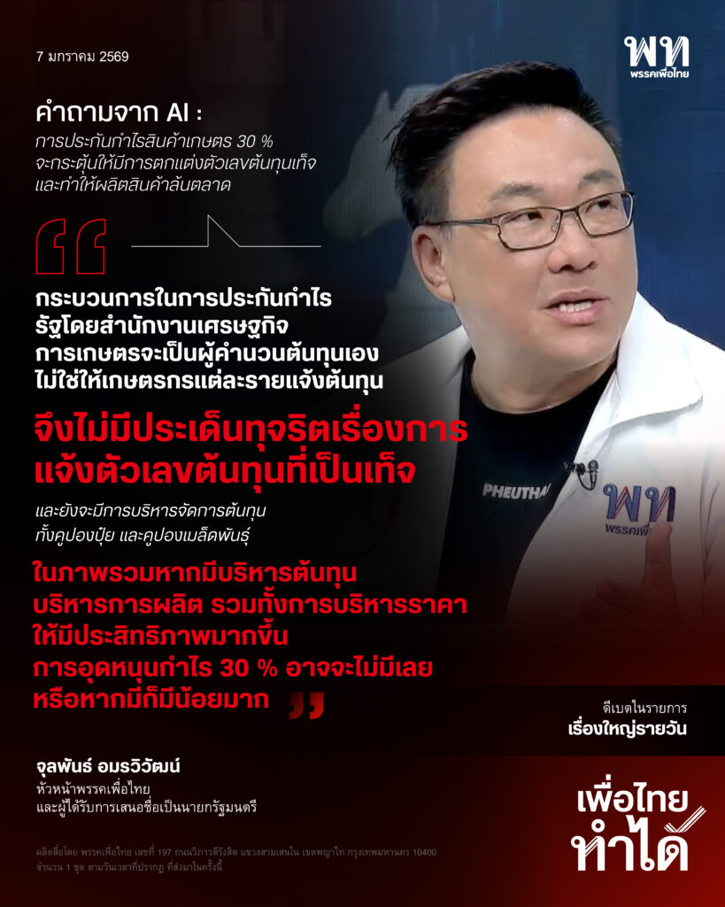 ส่วนในการดำเนินการจริงนั้นจะต้องมีหลายเรื่องประกอบกัน ไม่ใช่อุดหนุนกำไรกลับคืนเข้าไป แต่จะมีการบริหารจัดการต้นทุนของเกษตรกรให้ลดลง โดยเพื่อไทยมีทั้งเรื่องคูปองปุ๋ย และคูปองเมล็ดพันธุ์