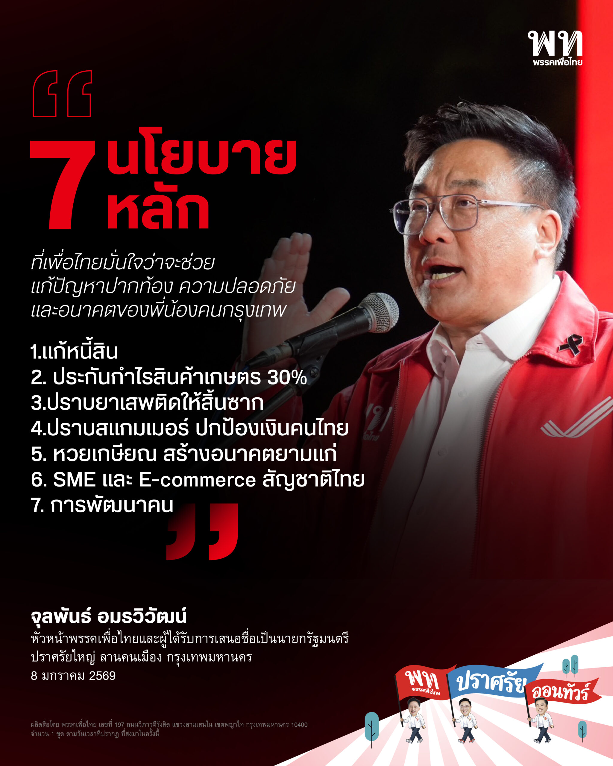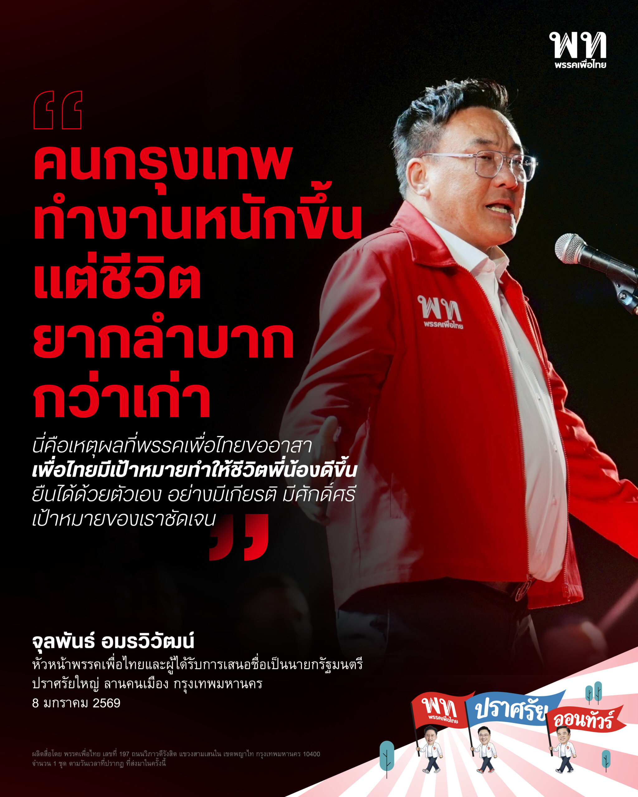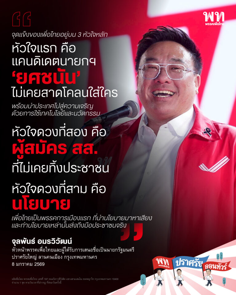 ส่วนหนึ่งของคำปราศรัยของนายจุลพันธ์ อมรวิวัฒน์ หัวหน้าพรรคเพื่อไทยและผู้ได้รับการเสนอชื่อเป็นนายกรัฐมนตรี พรรคเพื่อไทย ปราศรัยใหญ่ที่ลานคนเมือง กรุงเทพมหานคร โดยนายจุลพันธ์ชี้ว่าชีวิตคนกรุงทำงานหนักแต่ชีวิตลำบาก รายได้ไม่พอรายจ่าย หนี้สินพุ่ง พรรคเพื่อไทยอาสาเข้ามาเปลี่ยนโครงสร้างเศรษฐกิจและสังคมทั้งระบบ เพื่อให้ประชาชนยืนได้ด้วยตัวเองอย่างมีศักดิ์ศรี พร้อมย้ำ 3 หัวใจหลัก ได้แก่ แคนดิเดตนายกรัฐมนตรี “เชน ยศชนัน วงศ์สวัสดิ์” ผู้มีความรู้ด้านวิชาการและแนวคิดสร้างสรรค์, ผู้สมัคร สส. กทม. ทั้ง 33 คน ที่ทำงานใกล้ชิดประชาชน และนโยบายที่พิสูจน์ได้จริง รวมถึงความพร้อมชูนโยบายหลัก 7 ด้าน และ วันที่ 8 กุมภาพันธ์นี้ ขอแรงคนไทยกาเพื่อไทย 2 ใบพา ดร.เชน-ยศชนัน เข้าทำเนียบ! โดยมีข้อความดังนี้