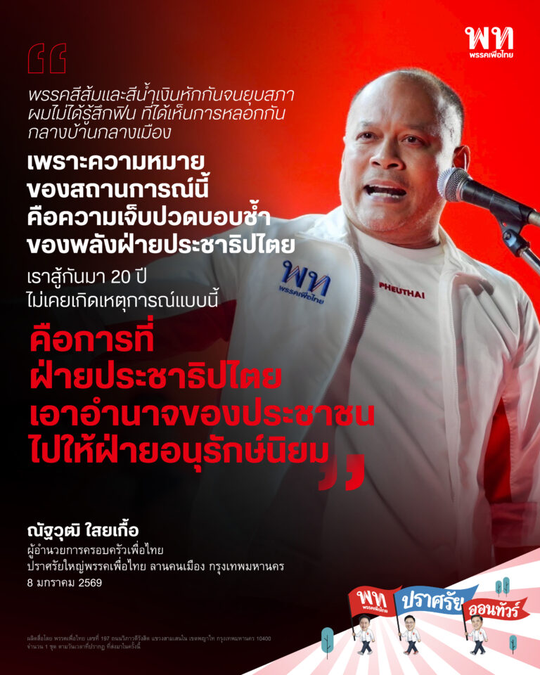 “มาวางเกมไว้เองแบบนี้ แล้วมาชวนพรรคเพื่อไทยไปเล่นด้วย พรรคเพื่อไทยไม่เอาด้วยหรอกครับ พรรคเพื่อไทยขอฟังเสียงประชาชน เพราะการฟังเสียงประชาชนคือเรื่องสง่างามที่สุดในวิถีประชาธิปไตย