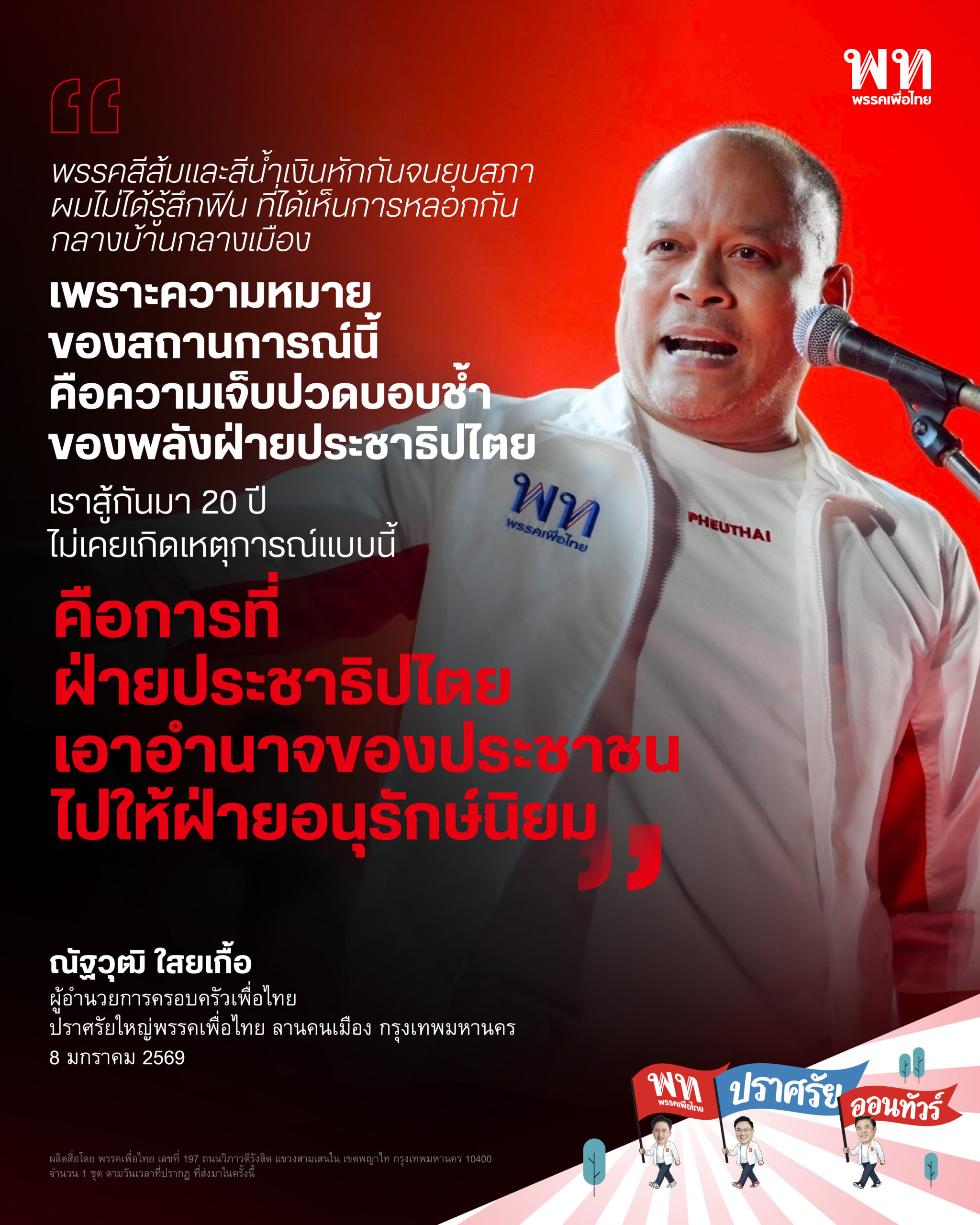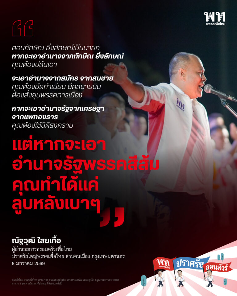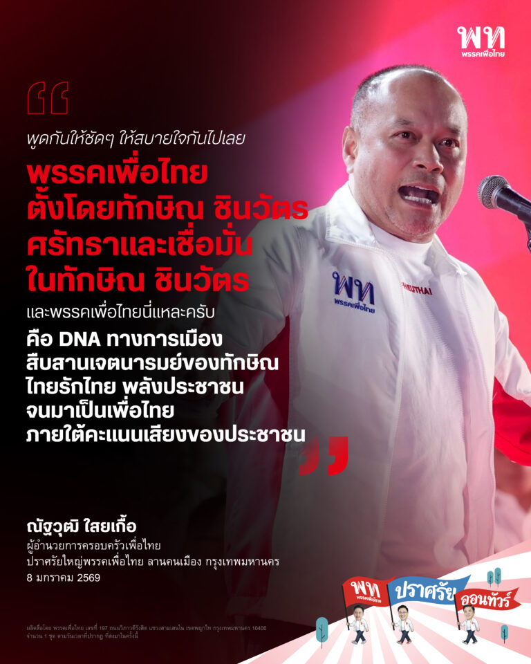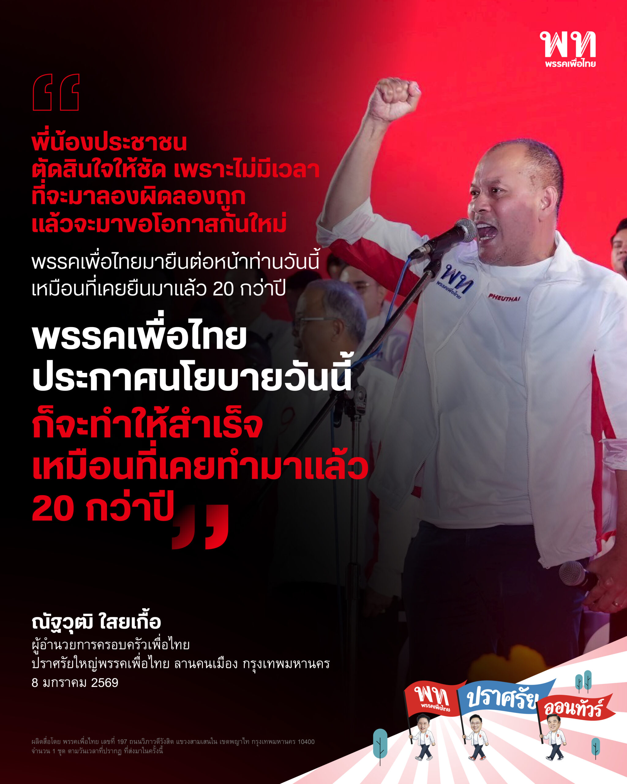 วันที่ 8 มกราคม 2569 เวลา 18.30 น. ณ ลานคนเมือง ศาลาว่าการกรุงเทพมหานคร (เสาชิงช้า) พรรคเพื่อไทยจัดงาน “ปราศรัยใหญ่ กรุงเทพมหานคร ครั้งที่ 1” โดยมีแกนนำพรรคและผู้สมัคร สส.กรุงเทพมหานคร เข้าร่วมอย่างคึกคัก หนึ่งในผู้ร่วมขึ้นเวทีปราศรัยคือ ณัฐวุฒิ ใสยเกื้อ ผู้อำนวยการครอบครัวเพื่อไทย