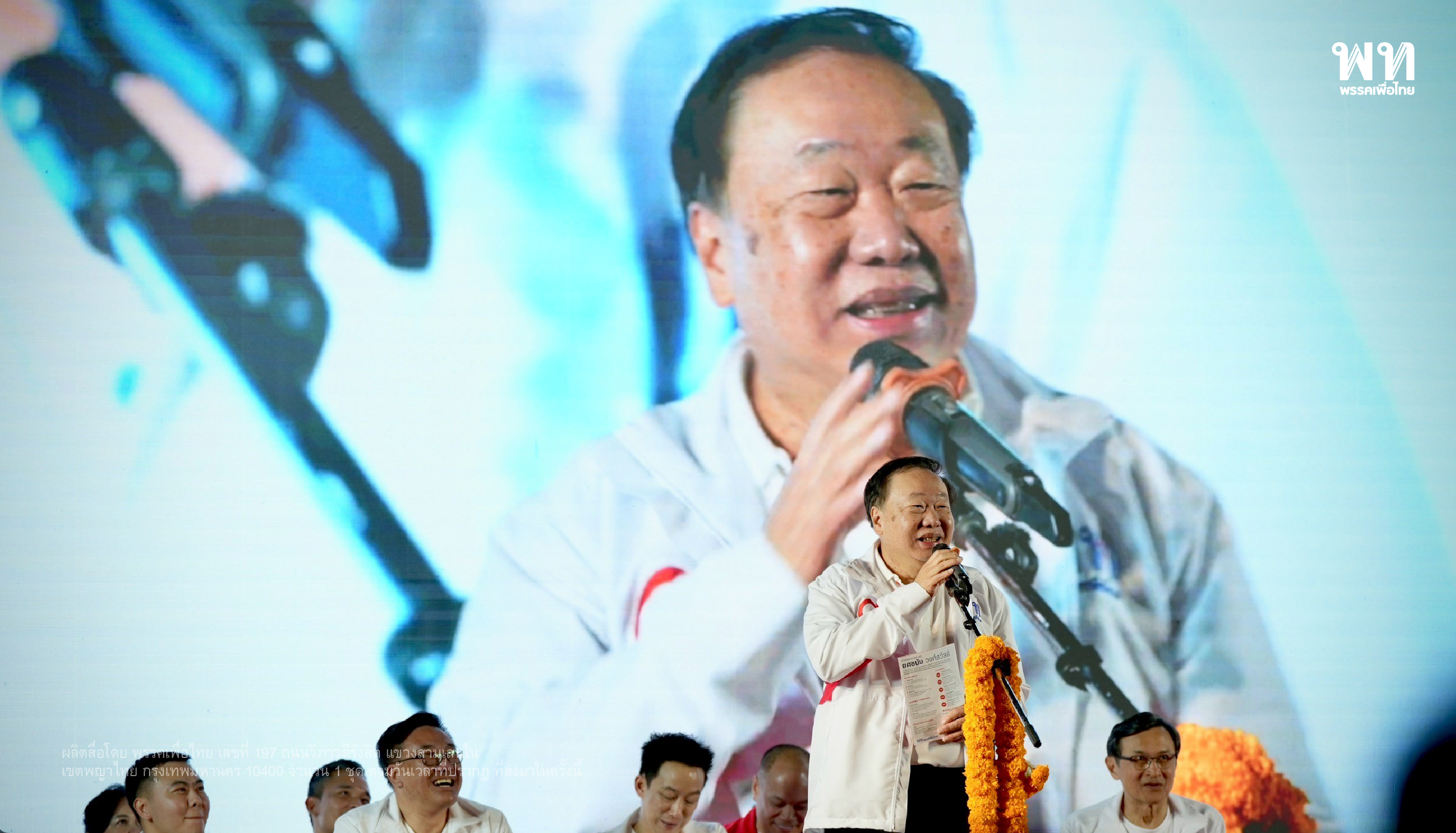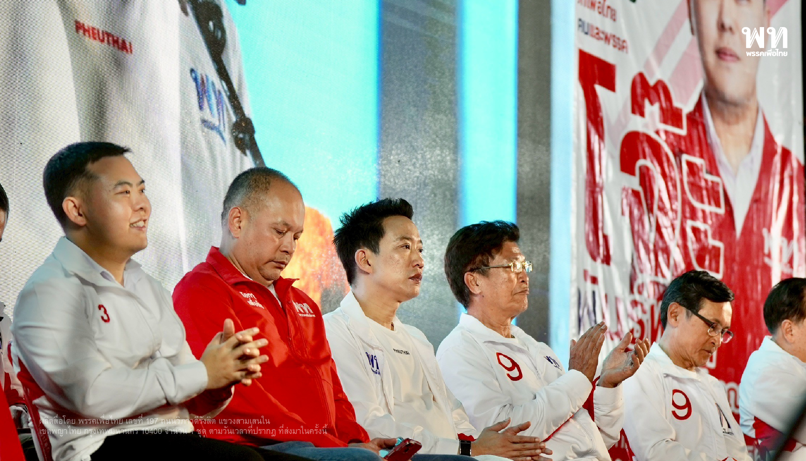 คณะปราศัยประกอบด้วย นายพงศ์ศรัณย์ อัศวชัยโสภณ ผู้สมัคร สส.แบบบัญชีรายชื่อ, นายศึกษิษฎ์ ศรีจอมขวัญ โฆษกพรรค และผู้สมัคร สส.แบบบัญชีรายชื่อ, นายสรวงศ์ เทียนทอง รองหัวหน้าพรรค และผู้สมัคร สส.สระแก้ว เขต 3 เบอร์ 1, นายจาตุรนต์ ฉายแสง ผู้สมัคร สส.แบบบัญชีรายชื่อ, นายสุชาติ ตันเจริญ ผู้สมัคร สส.แบบบัญชีรายชื่อ, นายณัฐวุฒิ ใสยเกื้อ ผู้ช่วยหาเสียง พรรคเพื่อไทย