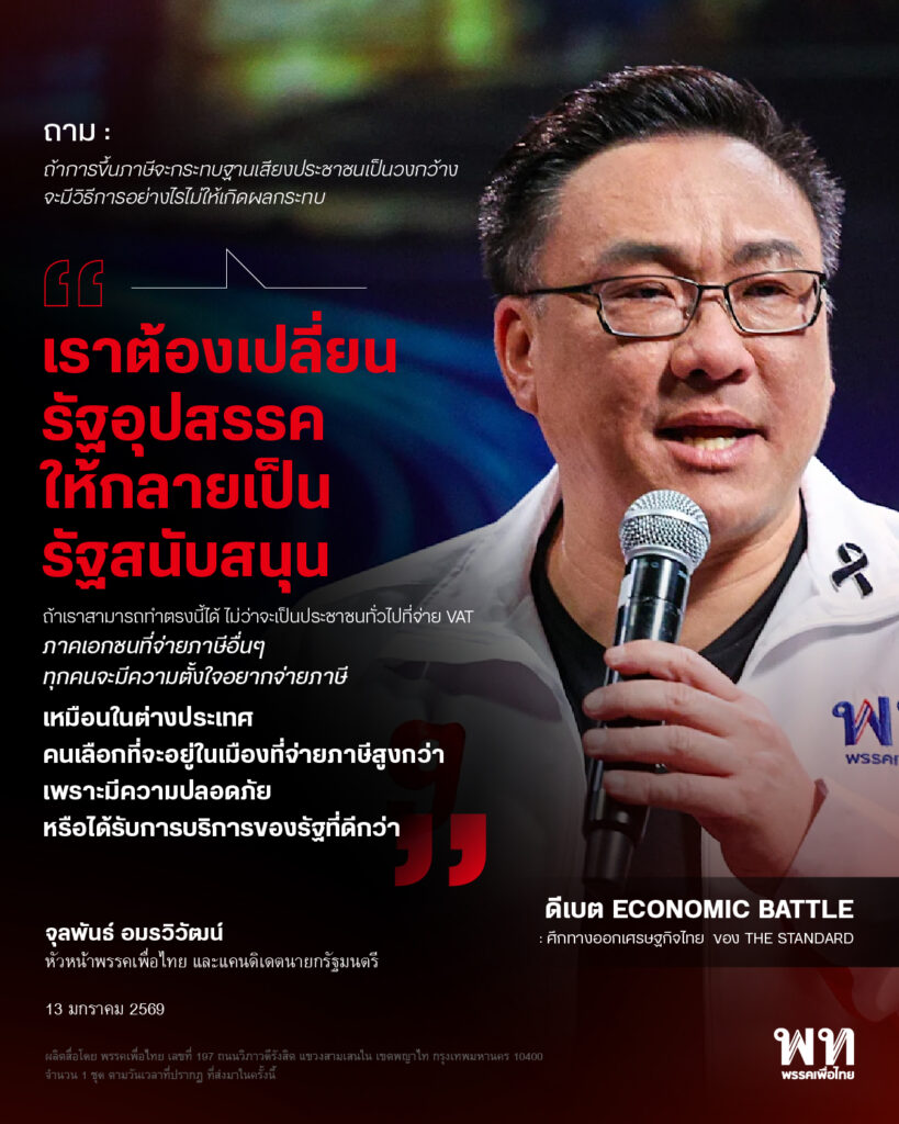 จุลพันธ์ อมรวิวัฒน์ หัวหน้าพรรคเพื่อไทย และแคนดิเดตนายกรัฐมนตรี ร่วมดีเบตในหัวข้อ ECONOMIC BATTLE : ศึกทางออกเศรษฐกิจไทย ของ THE STANDARD วันที่ 13 มกราคม 2569