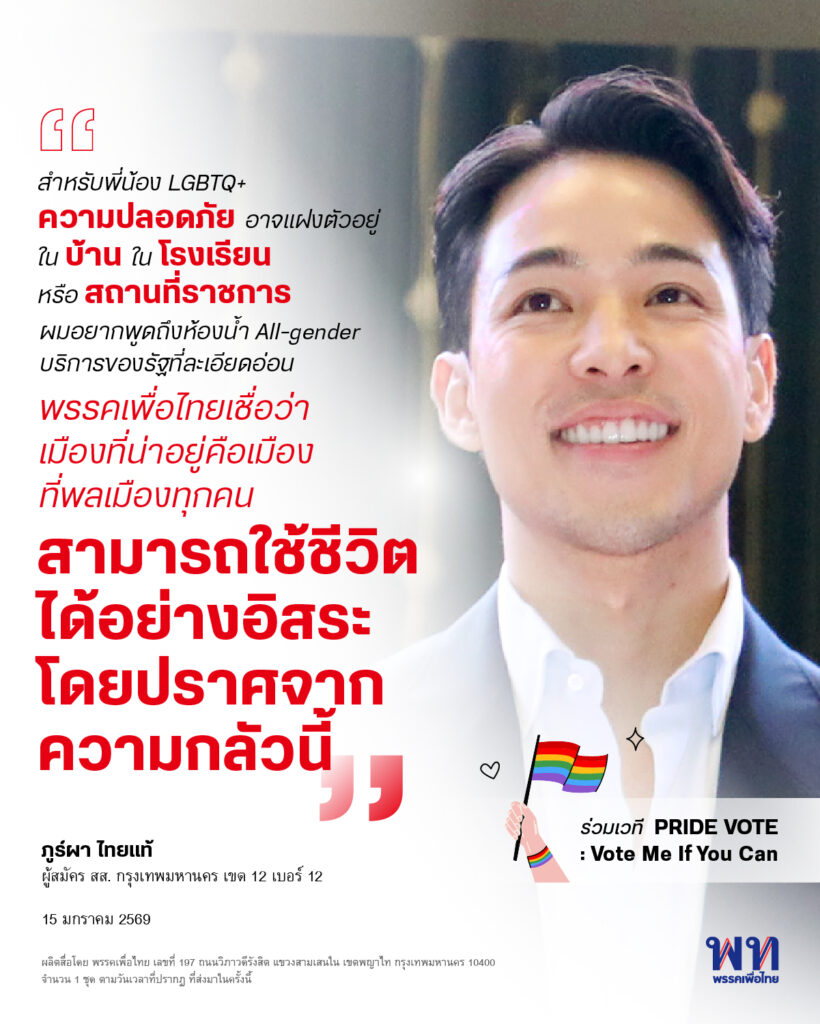 พรรคเพื่อไทยร่วมแสดงวิสัยทัศน์ในเวที ‘PRIDE VOTE : Vote Me If You Can’ (14 มกราคม 2569) ณ SCBx Next Tech สยามพารากอน พรรคเพื่อไทยร่วมแสดงวิสัยทัศน์เจาะลึกนโยบายด้านสิทธิและความหลากหลายทางเพศ ในงานจะเป็นการเลือกคำสำคัญและให้ตัวแทนจากพรรคการเมืองร่วมแสดงวิสัยทัศน์จากคำสำคัญนั้นๆ