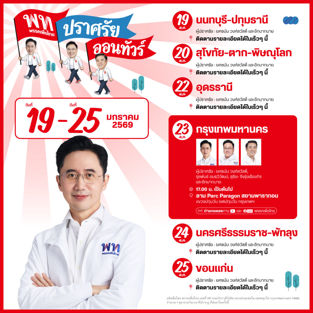 เพื่อไทย ปราศรัย ออนทัวร์! สัปดาห์นี้ แคนดิเดต และทีมพรรคเพื่อไทยไปปราศรัยที่ไหนบ้าง เปิดตารางชวนทุกคนนั่งฟังปราศรัยกันสดๆ สำหรับพี่น้องภาคอื่นๆ รอกันอีกนิด และโปรดติดตามตารางปราศรัยครั้งถัดไปจะไปไหนต่อ ในเร็วๆ นี้