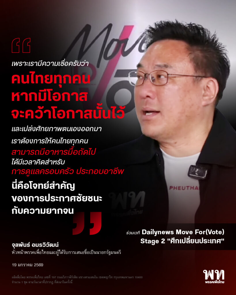 จุลพันธ์ อมรวิวัฒน์ หัวหน้าพรรคเพื่อไทยและผู้ได้รับการเสนอชื่อเป็นนายกรัฐมนตรี ร่วมเวที Dailynews Move For(Vote) Stage 2 “ศึกเปลี่ยนประเทศ” ปฏิรูปเศรษฐกิจ ยกร่าง ล้างบางหรือแค่บริหารต่อ? ร่วมแสดงวิสัยทัศน์ในประเด็นสำคัญในการแก้ปัญหาและพัฒนาประเทศทั้งในแง่การปฏิรูปทางการเมือง และการดูแลแก้ปัญหาเศรษฐกิจ
