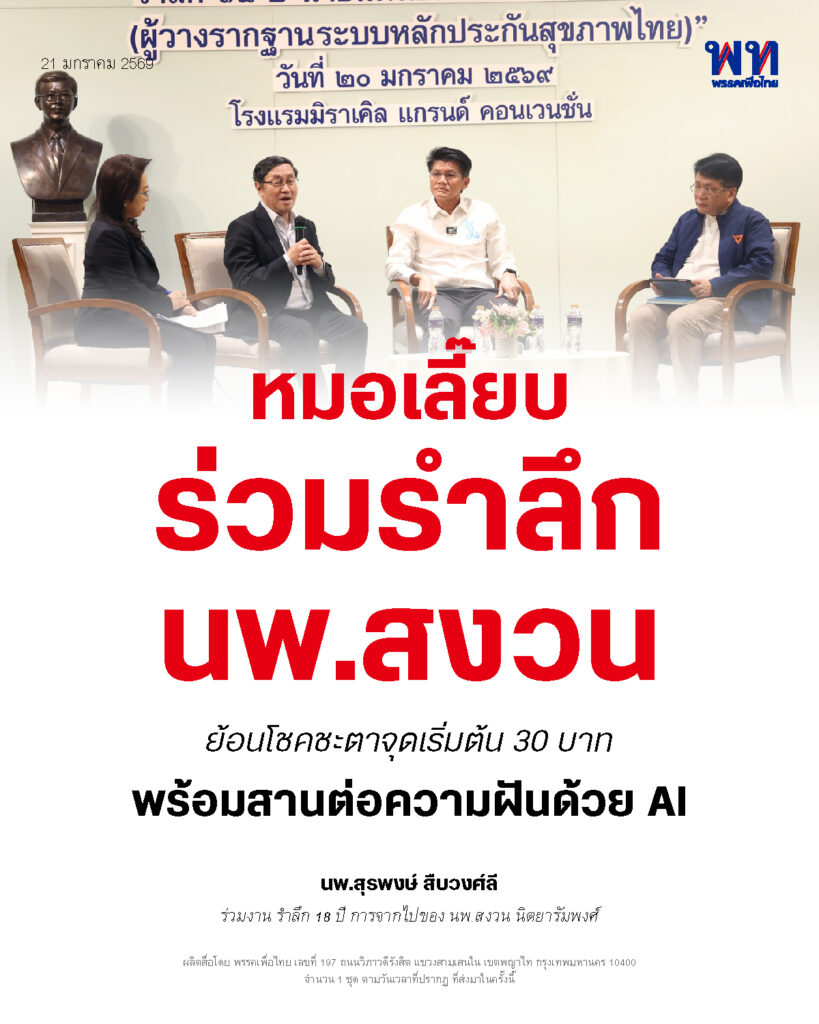 นพ.สุรพงษ์ สืบวงศ์ลี และ ทันตแพทย์หญิง ศรีญาดา ปาลิมาพันธ์ ร่วมงาน ‘รำลึก 18 ปี การจากไปของ นพ.สงวน นิตยารัมพงศ์ (ผู้วางรากฐานระบบหลักประกันสุขภาพของประเทศไทย)’ ณ โรงแรมมิราเคิล แกรนด์ กรุงเทพฯ (22 มกราคม 2569) โดยมี นพ.สุรพงษ์ ร่วมเวทีเสวนา ย้อนรำลึกจุดเริ่มต้นสิทธิบัตรทอง การทำงานร่วมกับหมอสงวน ยืนยันความสำคัญของหลักประกันสุขภาพถ้วนหน้า พร้อมเสนอแนวทางยกระดับ 30 บาทสู่อนาคตด้วย AI และเสนอเปลี่ยนความคิดเพื่อสร้างระบบที่เป็นอุดมคติใหม่