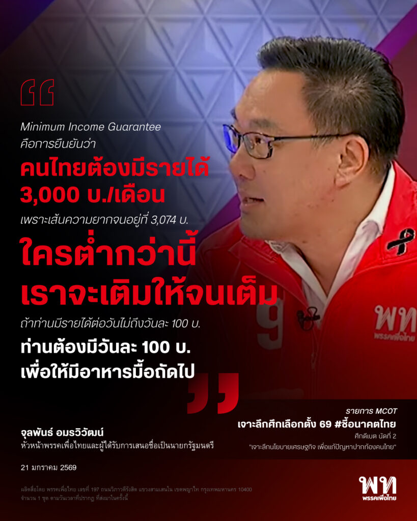 “เรามีนโยบายคนไทยไร้จน เพราะการทำเรื่อง Minimum Income Guarantee คือการยืนยันว่าคนไทยต้องมีรายได้ต่อเดือน 3,000 บ. เพราะเส้นความยากจนอยู่ที่ 3,074 บาท ใครต่ำกว่านี้เราจะเติมให้จนเต็ม