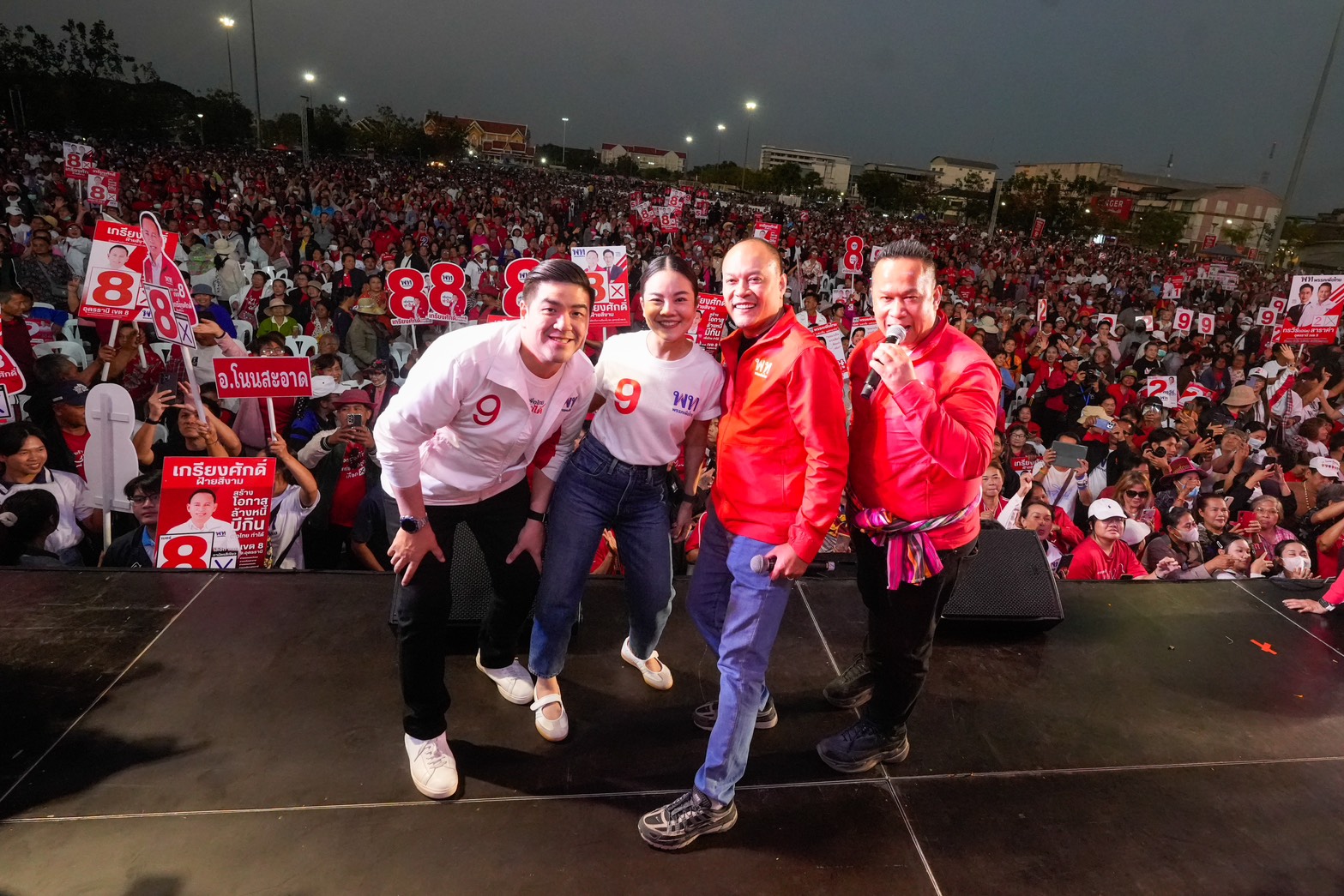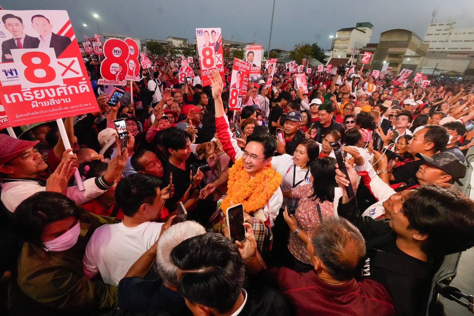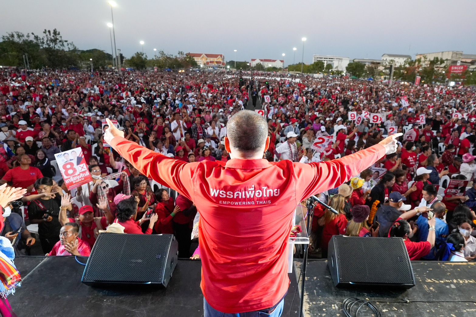 วันนี้ (22 ม.ค.) บรรยากาศการปราศรัยใหญ่ของพรรคเพื่อไทย ณ ทุ่งศรีเมือง จ.อุดรธานี เป็นไปอย่างคึกคักโดยมีประชาชนร่วมนับหมื่นคน เมื่อเวลา 18.15 น. ศ.ดร.ยศชนัน วงศ์สวัสดิ์ แคนดิเดตนายกรัฐมนตรีพรรคเพื่อไทย พร้อมด้วยนายภูมิธรรม เวชยชัย อดีตรองนายกรัฐมนตรี และผู้สมัคร สส.บัญชีรายชื่อพรรคเพื่อไทย และแกนนำพรรคเพื่อไทยจำนวนมากร่วมเวที โดยดวทีที่ทุ่งศรีเมืองในวันนี้ ถือว่าเป็นเวทีสุดท้ายของทริปทัวร์อีสานเหนือ 2 วัน 3 จังหวัด 7 เวที ตั้งแต่จังหวัดบึงกาฬ หนองคาย และอุดรธานี มีพี่น้องนำพวงมาลัยดอกดาวเรือง หมูยอ แจ่วบอง ข้าวแต๋นมามอบให้จนเต็มคอ ทั้งนี้ ในช่วงที่ ศ.ดร.ยศชนัน ถ่ายภาพร่วมกันกับผู้สมัคร สส.อุดรธานี พรรคเพื่อไทย ประชาชนชาวอุดรธานีได้พร้อมใจกันเปิดแฟลชโทรศัพท์เป็นแบ็กกราวนด์ไปด้วย