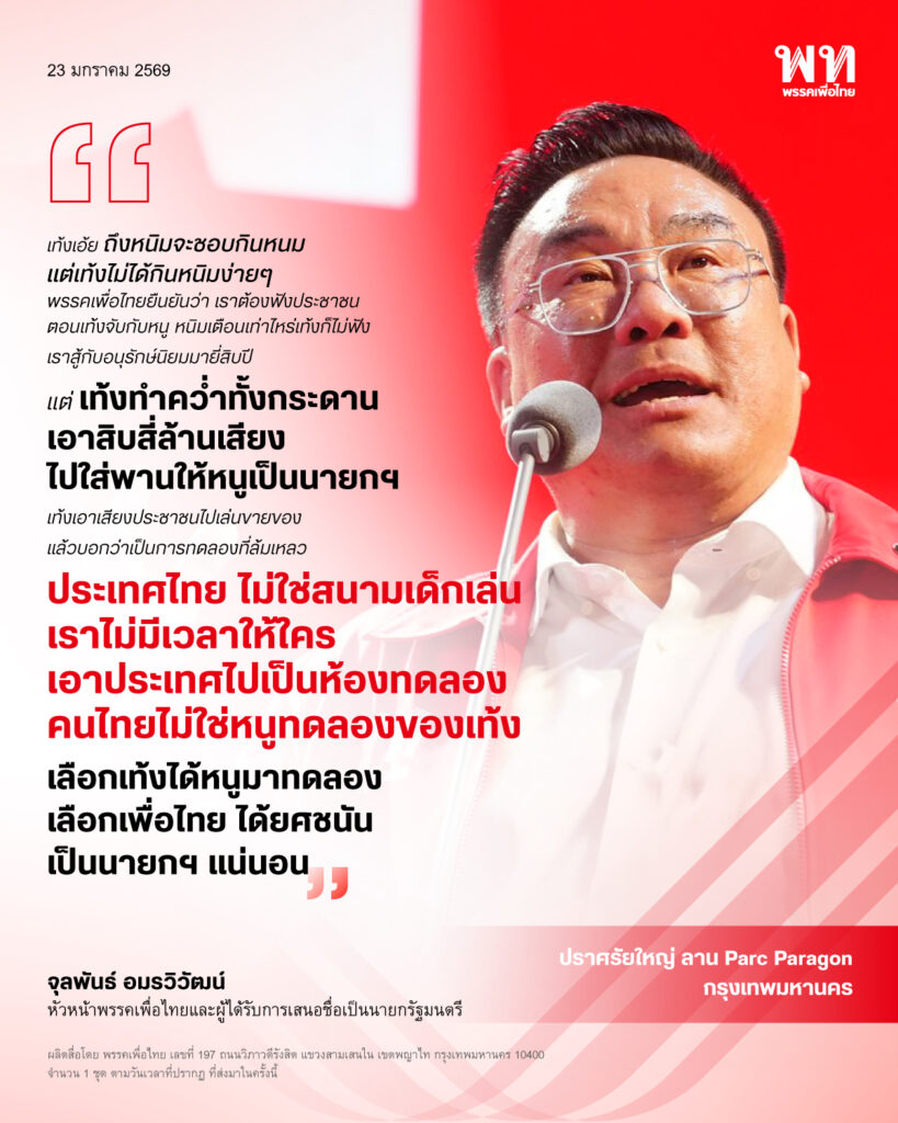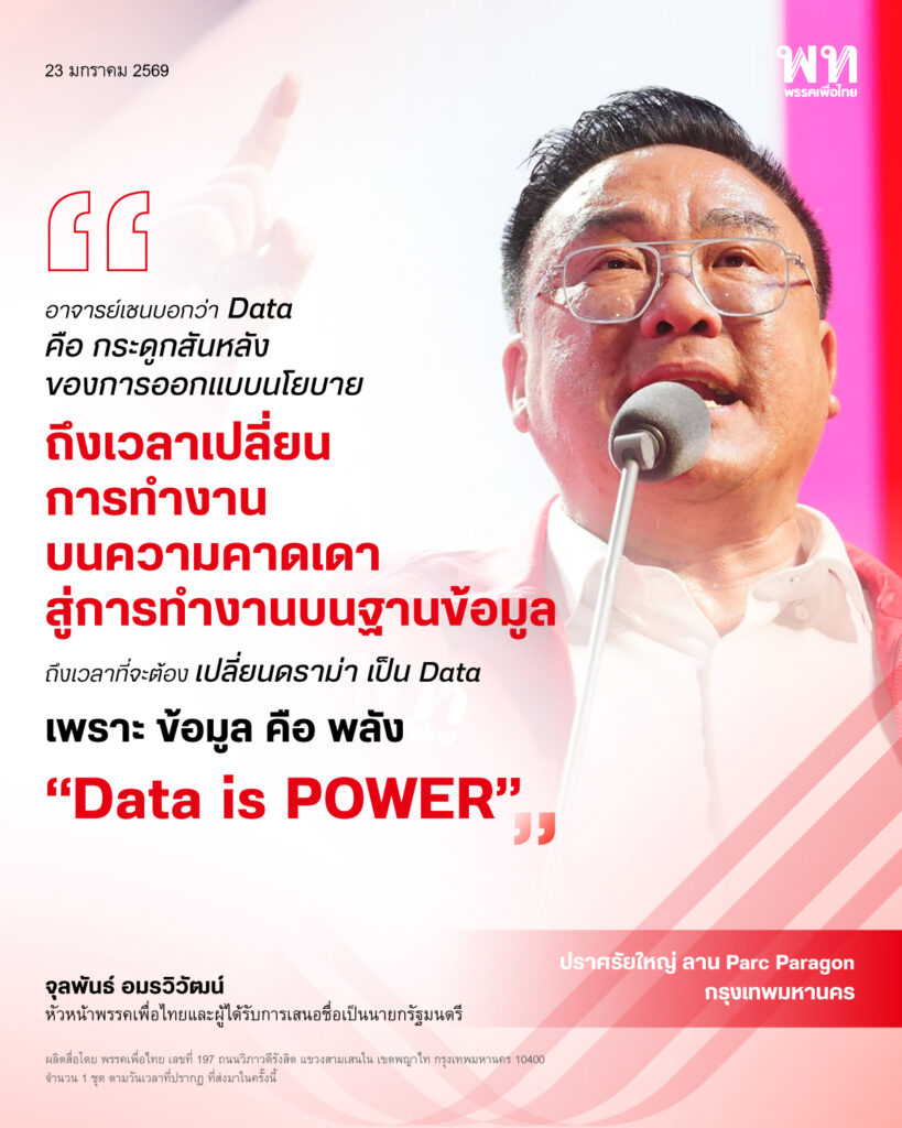 จุลพันธ์ ประกาศนโยบายใหญ่ สร้างเศรษฐี 9 คน ทุกวัน! กลางกรุงเทพ วันนี้ (23 มกราคม 2569) บนเวทีปราศรัยใหญ่พรรคเพื่อไทย ณ ลาน Parc Paragon จุลพันธ์ อมรวิวัฒน์ หัวหน้าพรรคและแคนดิเดตนายกฯ พรรคเพื่อไทย ประกาศนโยบายสำคัญ ‘รวยทุกวันเงินล้าน 9 คน’ นโยบายที่จะมอบรางวัลให้กับประชาชนคนไทย 5 กลุ่ม ทุกวัน รางวัลละ 1 ล้านบาท โดยมีเงื่อนไขเพียงการอยู่ในระบบ โดยเฉพาะระบบภาษีและการจับจ่ายที่มีการเสียภาษีเป็นสำคัญ ในการประกาศนโยบาย จุลพันธ์ชี้ว่าเป็นกลไกสำคัญในการนำประเทศไปสู่เศรษฐกิจรายได้สูง จูงใจประชาชนเข้าสู่ระบบภาษี และเป็นการสร้างฐานข้อมูลสำคัญ ทำให้รัฐบาลมองเห็นพื้นที่เปราะบางและกำหนดพื้นที่การพัฒนาอย่างแม่นยำได้ด้วยฐานข้อมูลขนาดใหญ่