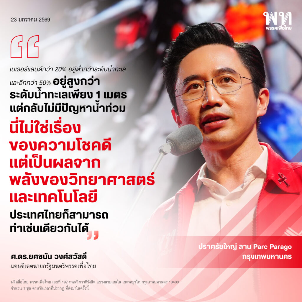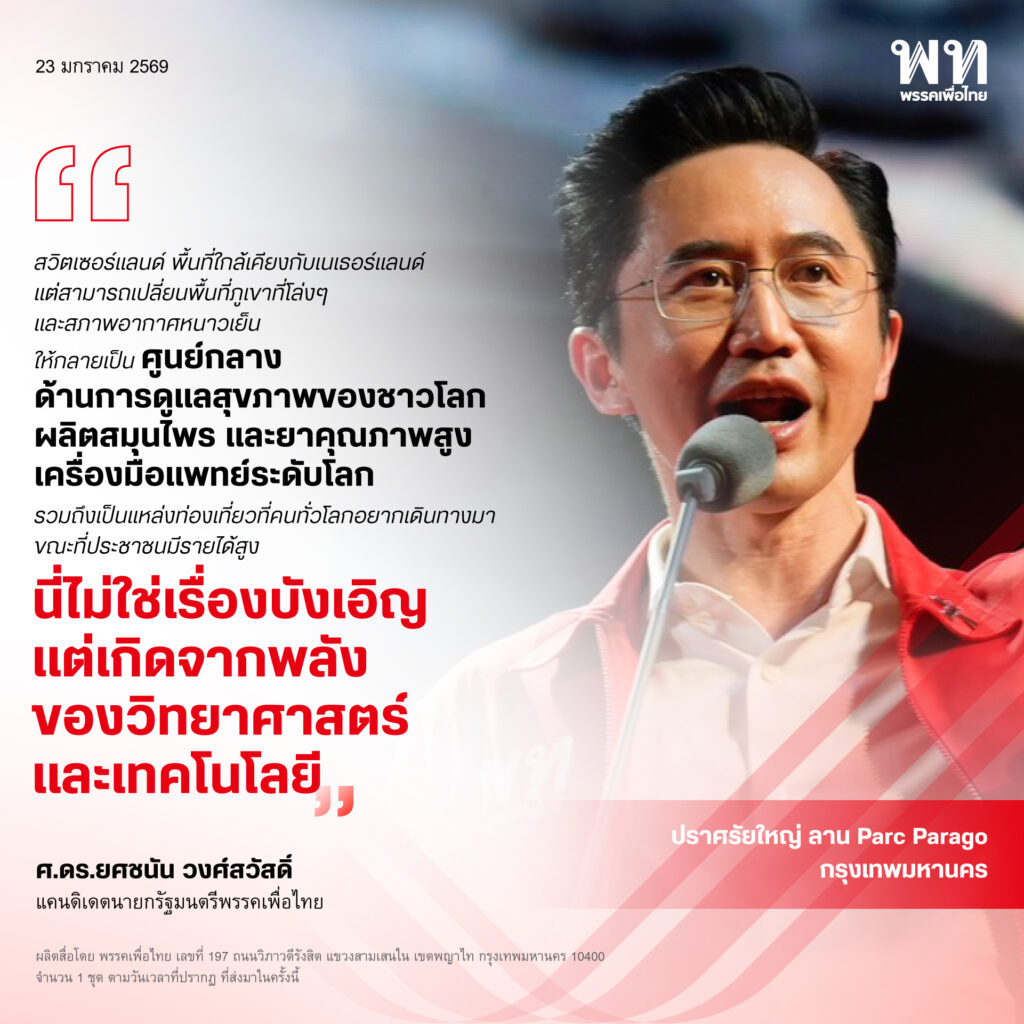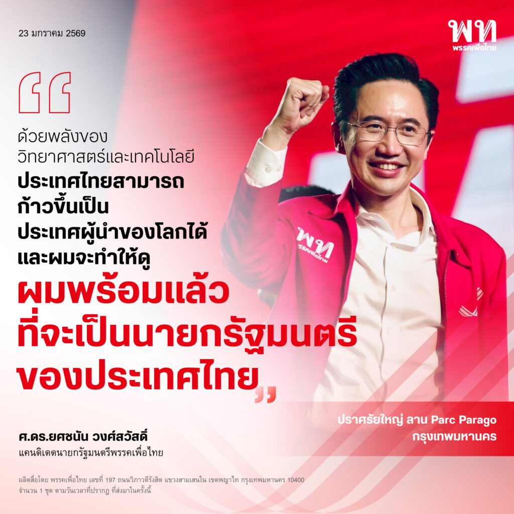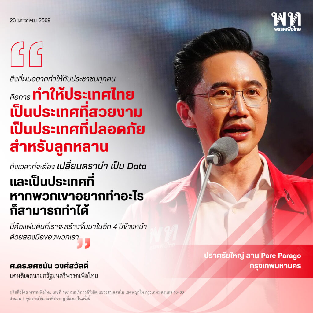 วันที่ 23 มกราคม 2569 เวลา 17.30 น. ศ.ดร.ยศชนัน วงศ์สวัสดิ์ แคนดิเดตนายกรัฐมนตรีพรรคเพื่อไทย ร่วมปราศรัยแสดงวิสัยทัศน์ในงานปราศรัยใหญ่พรรคเพื่อไทย ครั้งที่ 2 ภายใต้หัวข้อ “ยกเครื่องเศรษฐกิจไทย เพื่อไทยทำได้” ณ ลานสยามพารากอน เขตปทุมวัน กรุงเทพฯ