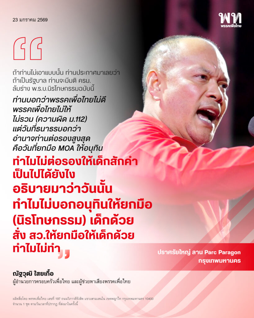 วันที่ 23 มกราคม 2569 เวลา 18.45 น. นายณัฐวุฒิ ใสยเกื้อ ผู้อำนวยการครอบครัวเพื่อไทย และผู้ช่วยหาเสียงพรรคเพื่อไทย ร่วมปราศรัยแสดงวิสัยทัศน์ในงานปราศรัยใหญ่พรรคเพื่อไทย ครั้งที่ 2 ภายใต้หัวข้อ “ยกเครื่องเศรษฐกิจไทย เพื่อไทยทำได้” ณ ลานสยามพารากอน เขตปทุมวัน กรุงเทพฯ โดยกล่าวว่า พรรคเพื่อไทยมีรถไฟฟ้า 20 บาทตลอดสาย อย่ารอหวังแต่รัฐบาลนี้ ที่มีแต่คนละครึ่ง ขนาด MOA ให้อยู่ 4 เดือนยังอยู่แค่ 2 เดือน ครึ่งเดียว ดังนั้น ขอให้รอเพื่อไทยดีกว่า การเลือกตั้งครั้งนี้พรรคเพื่อไทยลงในนามผู้ท้าชิง เพราะมีคนถูกหวยสีส้มเข้าไปเป็นนายกรัฐมนตรี ซึ่งเมื่อก่อนไม่ได้ลงหาเสียง แต่เดี๋ยวนี้ลงบ่อยขึ้น บอกหาเสียงแบบออแกนิค ที่ใช้ออแกไนซ์ ไปไหนคนเยอะ นักข่าวตรึมทุกที่ แล้วไปพูดปราศรัยจังหวัดชายแดนว่าจะปักธงชิงพื้นที่พรรคเพื่อไทย สร้างความชอบธรรมจากการจัดการสถานการณ์ชายแดน