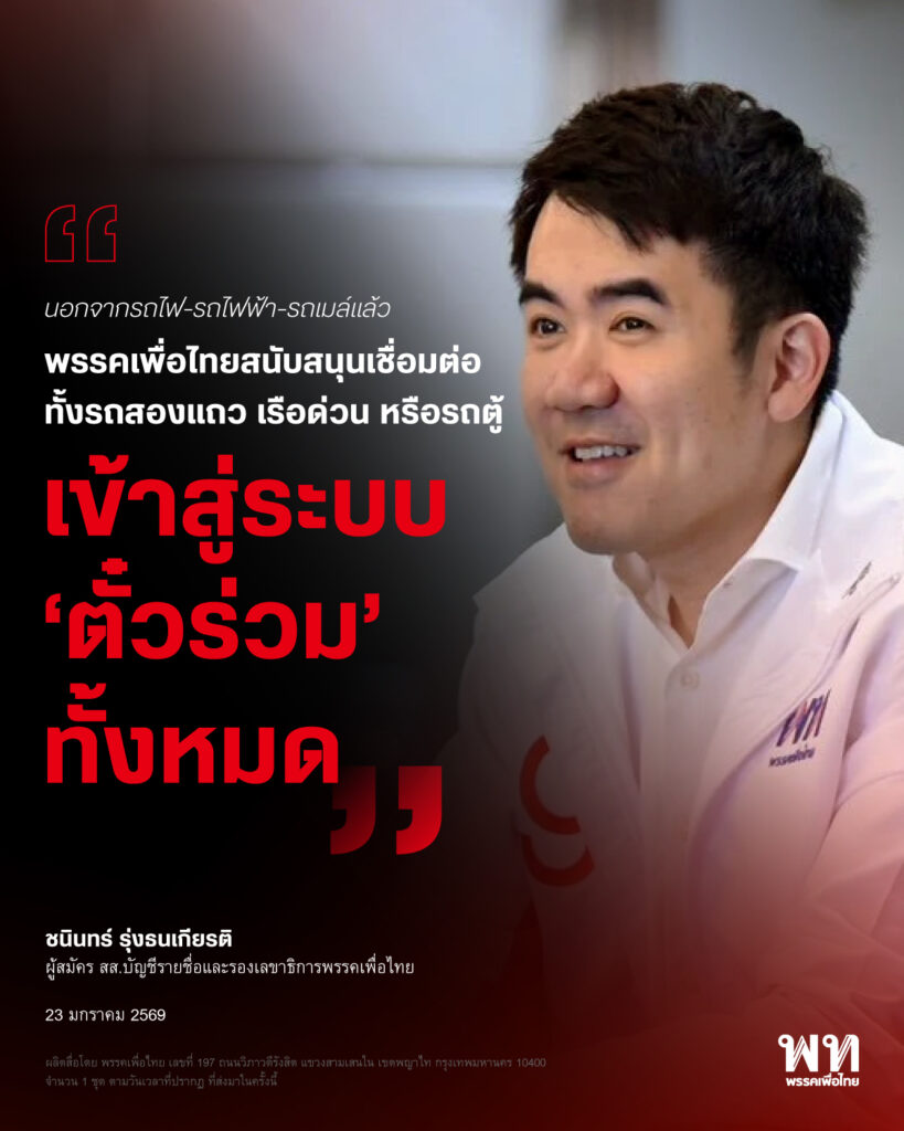 เมื่อวันที่ 23 มกราคม 2569 นายชนินทร์ รุ่งธนเกียรติ ผู้สมัคร สส.บัญชีรายชื่อและรองเลขาธิการพรรคเพื่อไทย เข้าร่วมงานเสวนา “ ขนส่งไร้รอยต่อ กรุงเทพอนาคตที่คุณเลือกได้” ที่จัดขึ้นโดยสภาองค์กรของผู้บริโภค โดยเชิญตัวแทนจากพรรคการเมืองร่วมแสดงวิสัยทัศน์ว่า พรรคเพื่อไทยเสนอแนวคิดเรื่องการทำให้ขนส่งสาธารณะเป็นบริการพื้นฐานที่ประชาชนเข้าถึงได้มาโดยตลอด โดยการเข้าถึงได้นี้ เราหมายถึงการเข้าถึงใน 3 ลักษณะ ได้แก่