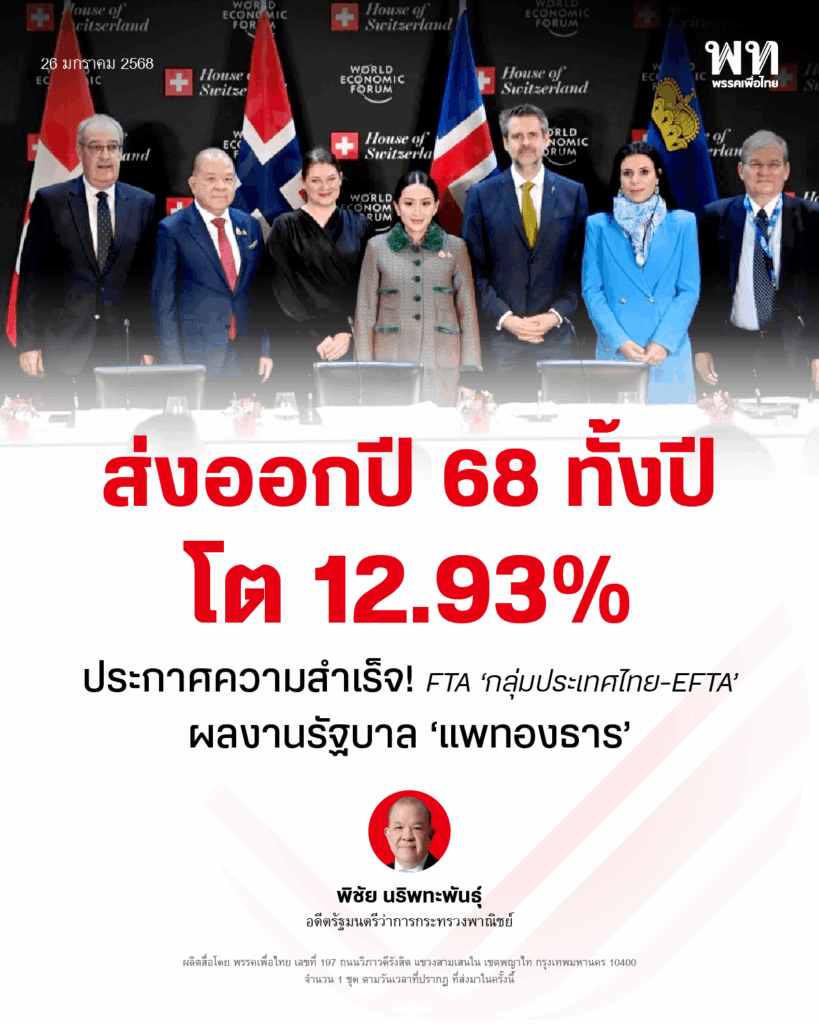 ความสำเร็จของการเจรจา FTA กับ EFTA ทำให้การส่งออกไปในประเทศกลุ่ม EFTA ในปี 68 ขยายตัวได้ถึง 78.66% และทำให้มีการขอส่งเสริมการลงทุนใน 9 เดือนแรกพุ่งถึง 1.37 ล้านล้านบาท มากกว่าปี 67 ทั้งปีที่มียอดการขอส่งเสริมและลงทุนจริงถึง 1.14 ล้านล้านบาท อีกทั้งการส่งออกปี 68 ที่ขยายตัว 12.93% ก็ขยายตัวต่อเนื่องจากการส่งออกปี 67 ที่ขยายได้ 5.4% ซึ่งเป็นการขยายตัวต่อเนื่องทั้งการส่งออกและการลงทุน และจะเป็นทิศทางที่จะทำให้เศรษฐกิจไทยฟื้นกลับมาได้ โดยสาเหตุที่ประเทศเวียดนามจะมีจีดีพีแซงไทยในปีนี้ ก็เพราะการส่งออกและการลงทุนของเวียดนามขยายตัวมากกว่าไทยมาตลอด 10 ปีที่ผ่านมานี้ อีกทั้งปัจจุบันเวียดนามมี FTA แล้วกับกว่า 60 ประเทศ