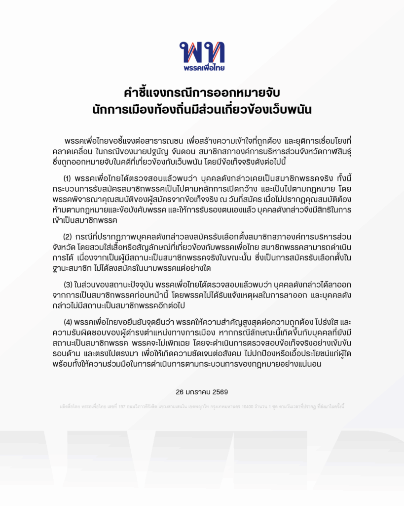 พรรคเพื่อไทยขอชี้แจงต่อสาธารณชน เพื่อสร้างความเข้าใจที่ถูกต้อง และยุติการเชื่อมโยงที่คลาดเคลื่อน ในกรณีของนายปฐนัญ จันดอน สมาชิกสภาองค์การบริหารส่วนจังหวัดกาฬสินธุ์ ซึ่งถูกออกหมายจับในคดีที่เกี่ยวข้องกับเว็บพนัน โดยมีข้อเท็จจริงดังต่อไปนี้