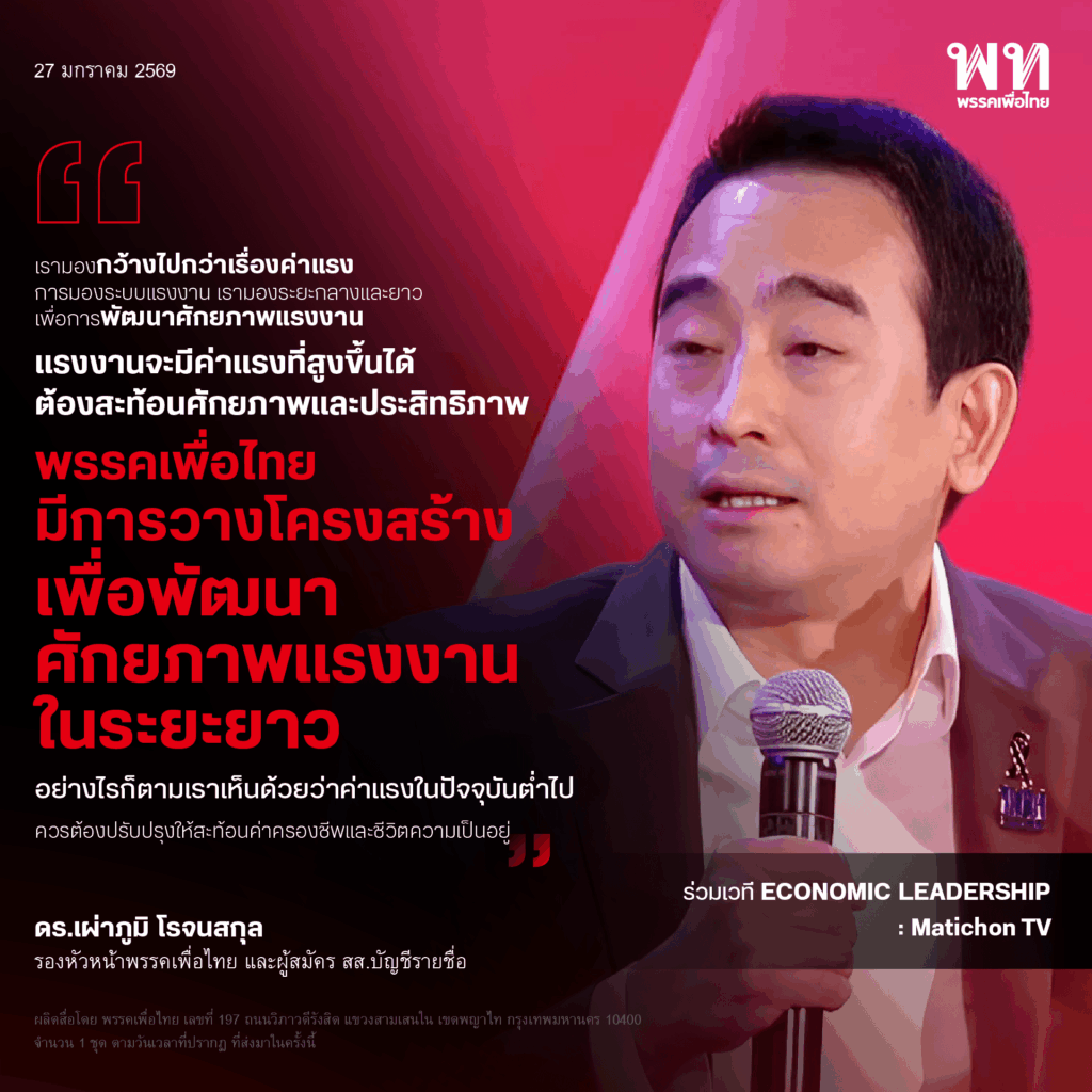 มองค่าแรงต้องมองทั้งระบบ ควบคู่ดูแล SME เผ่าภูมิ โรจนสกุล แสดงวิสัยทัศน์มิติเศรษฐกิจ พร้อมทั้งตอบปัญหาเศรษฐกิจซึ่งเป็นปัญหาสำคัญของประเทศ