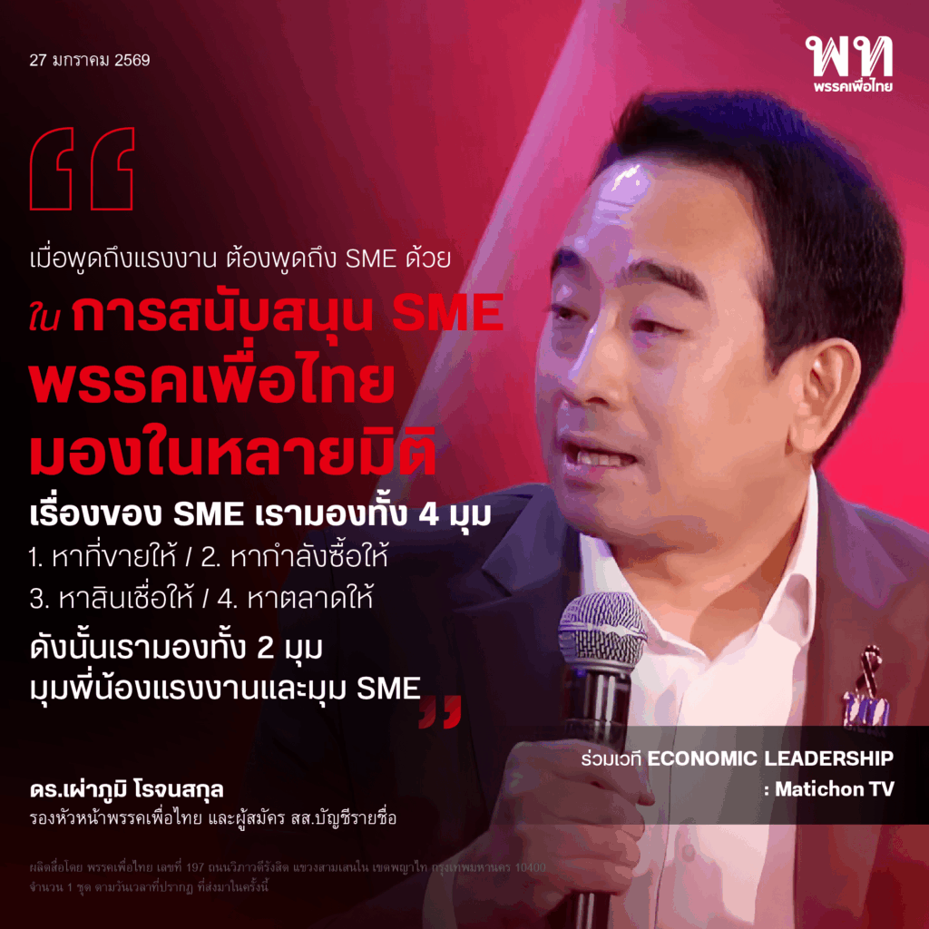 นอกจากการดูแลด้านแรงงานและพี่น้องแรงงานแล้ว ดร. เผ่าภูมิ ยังเน้นย้ำว่าต้องดูแล SME คู่ขนานไปพร้อมกัน ซึ่งต้องดูแลทั้งระบบเช่นเดียวกัน และอธิบายการดูแลโดยพรรคเพื่อไทยทั้ง 4 มิติ คือ